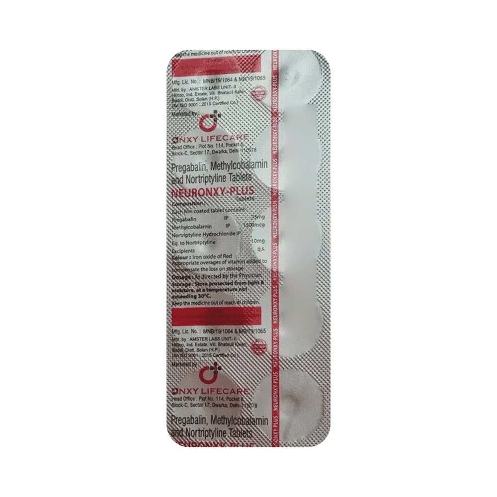 Neuronxy-Plus Tablet is a combination of three medicines: Pregabalin, Nortriptyline and Methylcobalamin. Pregabalin is an alpha 2 delta ligand which decreases pain by modulating calcium channel activity of the nerve cells. Nortriptyline is a tricyclic antidepressant which increases the levels of chemical messengers (serotonin and noradrenaline) that stop the movement of pain signals in the brain. Methylcobalamin is a form of vitamin B which helps in the production of myelin, a substance that protects nerve fibers and rejuvenates damaged nerve cells. Together, they relieve neuropathic pain (pain from damaged nerves).