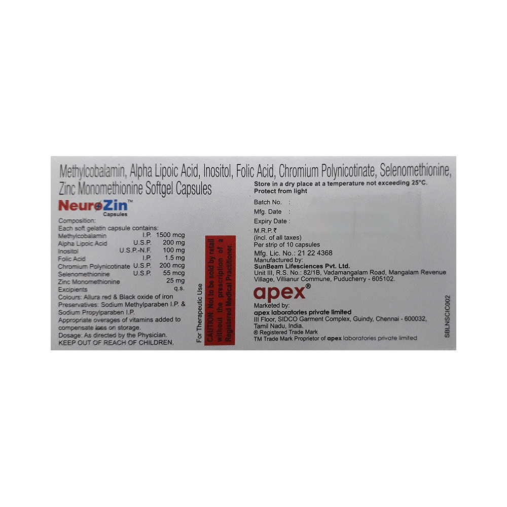 Neurozin Softgel Capsule is a combination of seven medicines: methylcobalamin, alpha lipoic acid, folic acid, inositol, chromium polynicotinate, selenomethionine, and zinc monomethionine. Methylcobalamin is a form of vitamin B12 that restores its level in the body, thereby helping in treating certain anemias and nerve problems. Alpha lipoic acid acts as a potent antioxidant (a substance that protects against cell damage) by neutralizing the free radicals (waste products formed in the body during energy production) such as reactive oxygen and nitrogen species. Further, it initiates natural antioxidant processes in the body. It also maintains the levels of vitamin E and vitamin C in the body. Folic acid is a form of vitamin B. It plays a vital role in the formation of red blood cells, which carry oxygen throughout the body. Inositol works by relaxing the blood vessels and improving blood flow to the legs, toes, and fingers, thereby relieving pain. Chromium polynicotinate, selenomethionine, and zinc monomethionine are nutritional supplements that provide essential nutrients to our body and improve overall health.