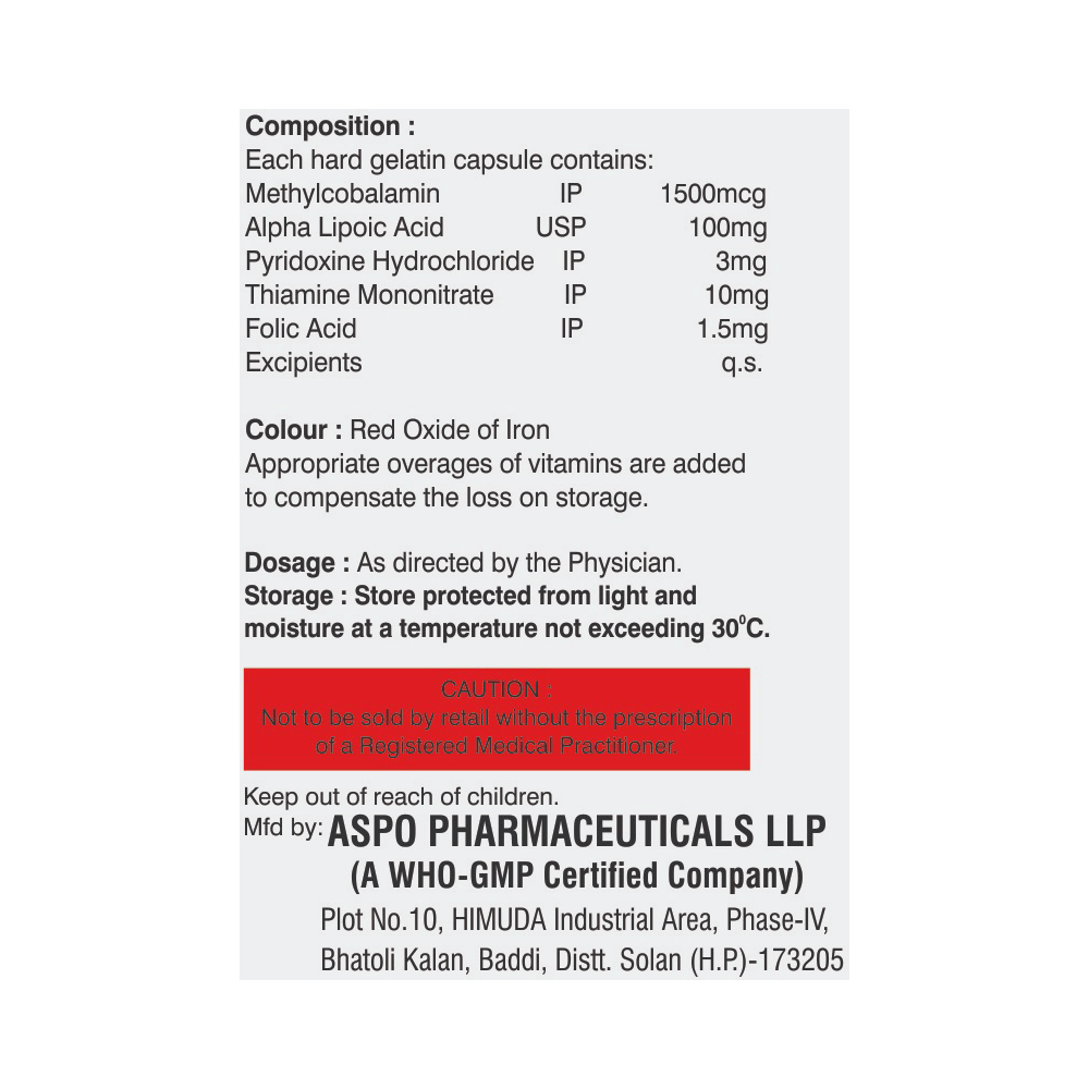Salt Composition: Methylcobalamin (1500mcg) + Alpha Lipoic Acid (100mg) + Thiamine mononitrate (10mg) + Pyridoxine Hydrochloride (3mg) + Folic Acid (1.5mg)