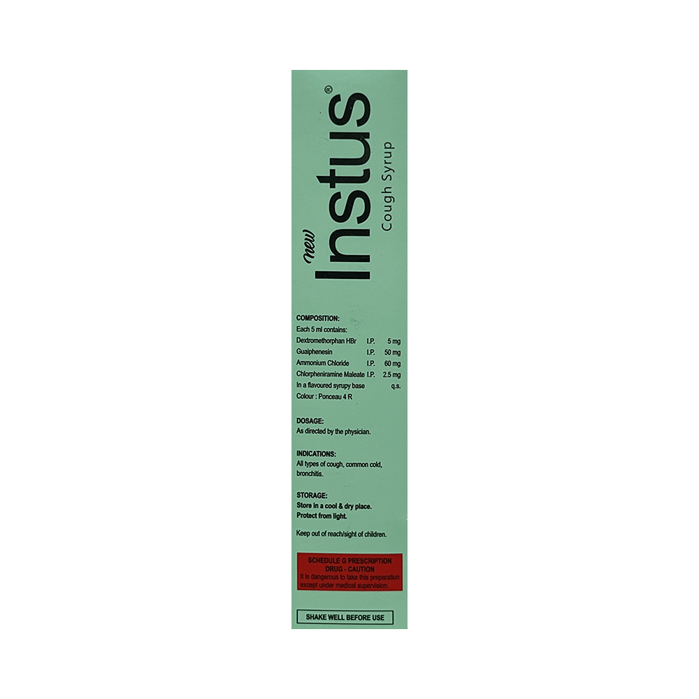 New Instus Cough Syrup Mixed Fruit is a combination medicine used to treat cough. It thins mucus in the nose, windpipe and lungs, making it easier to cough out. It also provides relief from runny nose, watery eyes and throat irritation. New Instus Cough Syrup Mixed Fruit is taken with or without food in a dose and duration as advised by the doctor. The dose you are given will depend on your condition and how you respond to the medicine. You should keep taking this medicine for as long as your doctor recommends. If you stop treatment too early your symptoms may come back and your condition may worsen. Let your doctor know about all other medications you are taking as some may affect, or be affected by this medicine.The most common side effects are nausea, stomach upset, diarrhea, stomach pain, vomiting, headache, and rash. Most of these are temporary and usually resolve with time. Contact your doctor straight away if you are at all concerned about any of these side effects. This medicine may cause dizziness and sleepiness, so do not drive or do anything that requires mental focus until you know how this medicine affects you. Avoid drinking alcohol while taking this medicine as it can make dizziness worse.Never support self-medication or recommend your medicine to another person. It is beneficial to have plenty of fluids while taking this medication. Before you start taking this medicine it is important to inform your doctor if you are suffering from liver or kidney disease. You should tell your doctor if you are pregnant or planning a pregnancy.