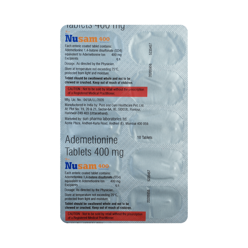 New Nusam 400 Tablet is a medicine used in the treatment of lintrahepatic cholestasis and other chronic liver diseases. It works by restoring the natural compound in the liver that helps protects liver cells from damage, improves the flow of bile, and supports overall healthy liver function. New Nusam 400 Tablet has also been studied for its possible role in cell membrane stabilization and as adjunctive management of neurodegenerative disorders. Research suggests it may help support brain health, protect nerve cell membranes, and assist in maintaining healthy communication between nerve cells.New Nusam 400 Tablet is usually recommended to be taken before meals, as this improves absorption. The exact dose depends on your body weight and the condition being treated. To get the most benefit, it is important to take this medicine regularly and at the same time each day. Treatment may need to continue for several months or longer, depending on your doctor’s advice. Even if your symptoms improve, do not stop taking it unless your doctor tells you to.The most common side effects of New Nusam 400 Tablet are nausea, abdominal discomfort, and diarrhea. These effects are usually mild and temporary. If diarrhea becomes bothersome, your doctor may adjust your dose or stop the treatment. Drinking plenty of fluids can help prevent dehydration if you experience diarrhea or constipation. Rarely, some people may also experience headache, trouble sleeping, or skin rash. If any side effect worries you, consult with doctor.New Nusam 400 Tablet should be used with caution in patients with a history of bipolar disorder, as this medicine may rarely trigger mood swings. Use during pregnancy and breastfeeding should only be under medical advice. This medicine can interact with other drugs, so let yor doctor know about all the medicines and supplements you are taking. Avoid drinking alcohol while on treatment, as this may increase the strain on your liver and worsen side effects.