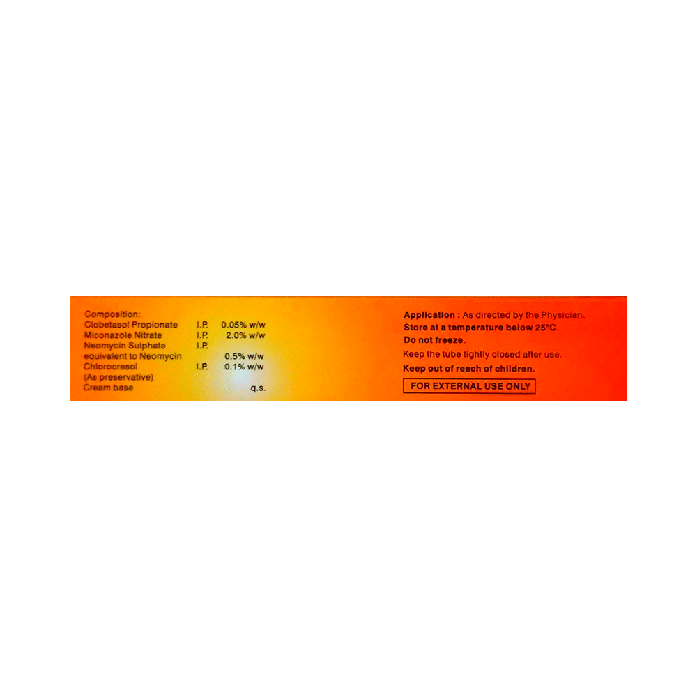 Salt Composition: Clobetasol (0.05% w/w) + Neomycin (0.5% w/w) + Miconazole (2% w/w) + Chlorocresol (0.1% w/w)