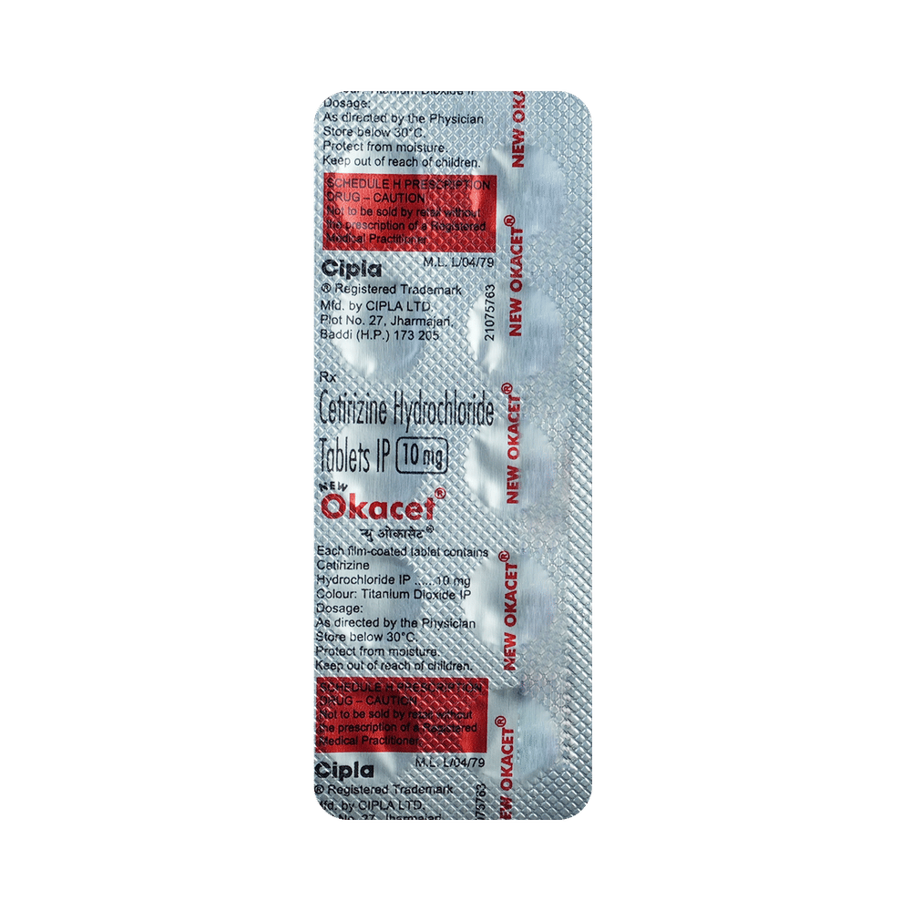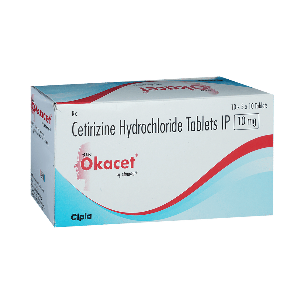 New Okacet Tablet belongs to a group of medicines called antihistamines. It is used to treat various allergic conditions such as hay fever, conjunctivitis and some skin reactions, and reactions to bites and stings. It relieves watery eyes, runny nose, sneezing, and itching. New Okacet Tablet can be taken with or without food. The dose required for you may vary depending on what you are taking it for. This medicine is usually taken in the evening but follow the advice of your doctor on how to take it. You may need this medicine only on days you have symptoms, but if you are taking it to prevent symptoms you should take it regularly. If you miss doses or stop taking it earlier than advised, your symptoms may come back.This medicine is generally very safe. The most common side effects include feeling sleepiness, dizziness, tiredness, and sore throat. These are usually mild and go away after a couple of days as your body adjusts. Consult your doctor if any of the side effects persist or worry you. You should avoid alcohol while taking this medicine.Before taking it, tell your doctor if you have any kidney problems or epilepsy. Your dose may need to be modified or this medicine may not be suitable. Some other medicines can interact with this medicine so let your healthcare team know what else you are taking. You should also talk to your doctor before using this medicine if you are pregnant or breastfeeding, although it is not thought to be harmful.