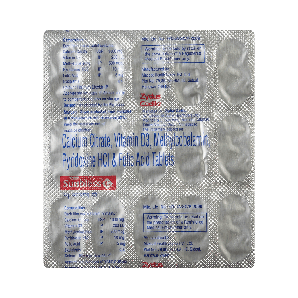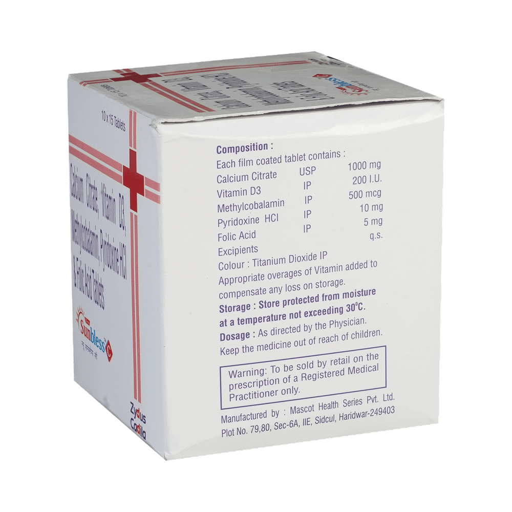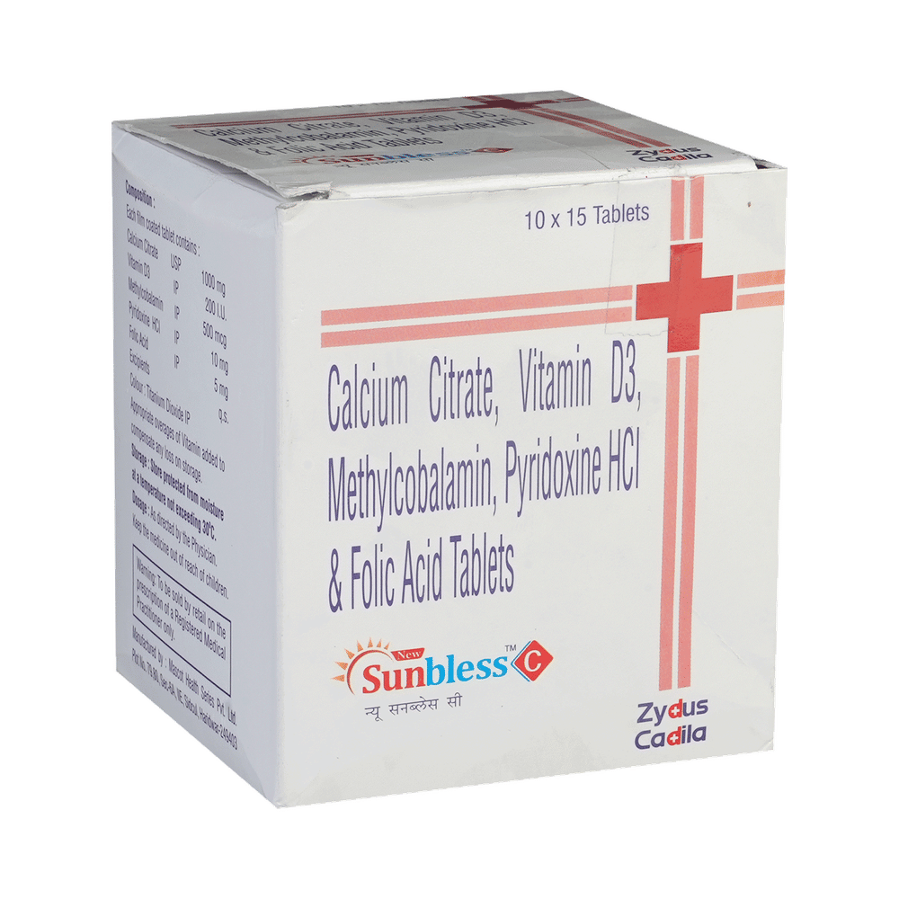 New Sunbless C Tablet is a combination of five nutritional supplements. Calcium increases calcium deposition in the bones, which increases the density of the bones and makes them stronger. Calcitriol is a synthetic vitamin D that regulates the absorption of calcium in the body and strengthens the bones. Methylcobalamin is an active form of vitamin B12. This helps in proper cell growth and development, protein synthesis, and the production of blood cells (red and white blood cells). Folic Acid is also known as folate or vitamin B9. It helps in producing blood (hemoglobin) in the body. Vitamin B6 (Pyridoxine) is a vitamin nutritional supplement that regulates essential metabolic functions. Together, they help in managing nutritional deficiencies.
