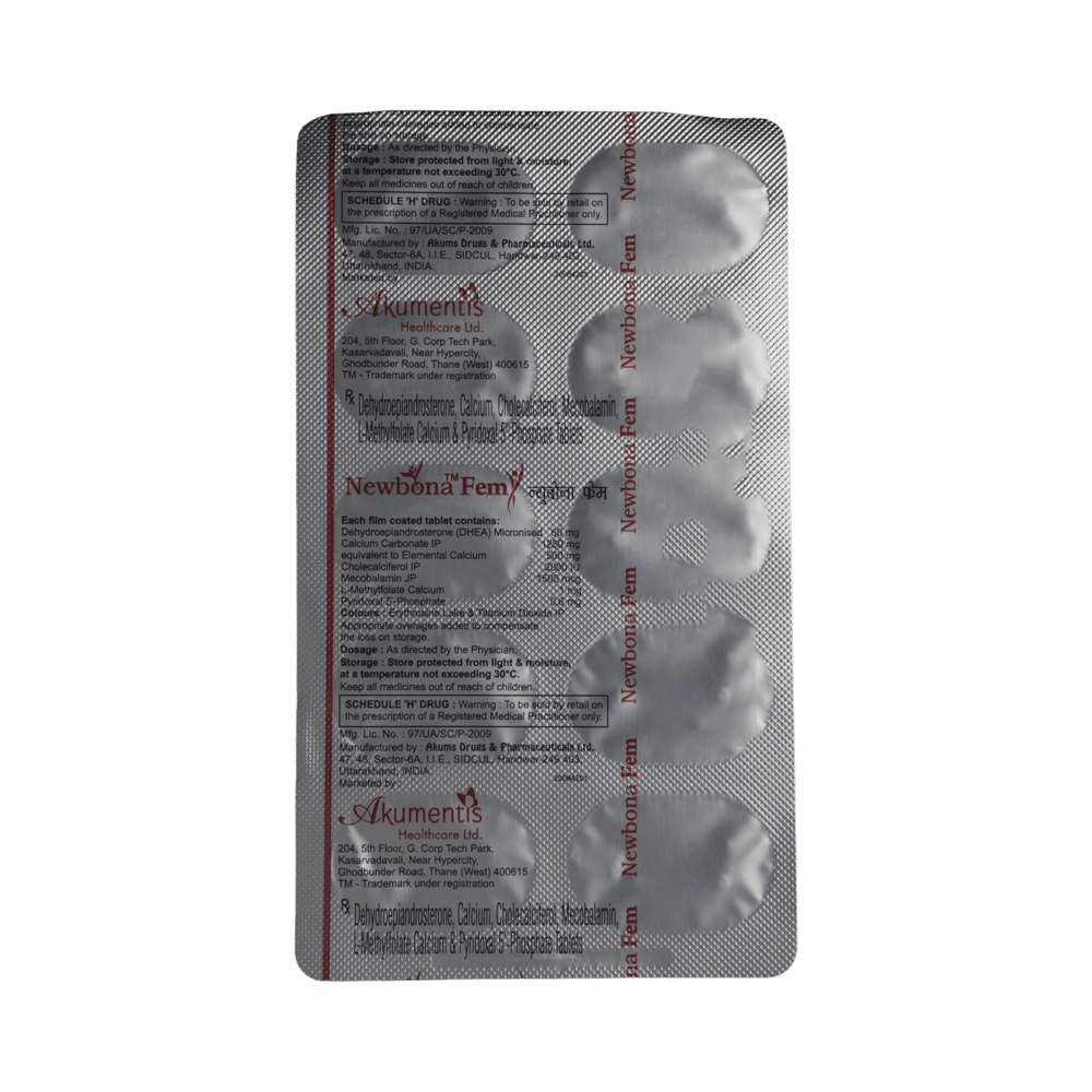 Newbona Fem Tablet is a combination of six dietary supplements. Dehydroepiandrosterone (Micronized) is a hormone that balances the levels of other hormones in the body, and it also slows down the aging process. Calcium makes the bone stronger by thickening the bones. Vitamin D3, Methylcobalamin, L-Methyl Folate, and Pyridoxal-5-phosphate are different types of vitamins that are formulated together to treat any multivitamin deficiency, which help to support and regulate bodily functions. This is how it works to provide nutrition to the body.