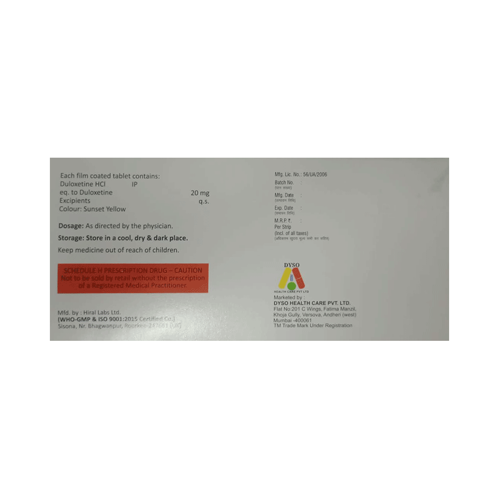 Nexduline 20 Tablet is used in the treatment of depression, anxiety disorder, diabetic nerve pain, fibromyalgia (a condition in which there are generalized pain and tenderness in the body), neuropathic pain, and stress urinary incontinence. Nexduline 20 Tablet works by increasing the level of chemical messengers (serotonin and noradrenaline) in the brain that have a calming effect on the brain and relax the nerves, thus treating your illness. It may be taken with or without food. It is advised to take this medicine at a fixed time each day to maintain a consistent level in the blood. If you miss any doses, take it as soon as you remember. Do not skip any doses and finish the full course of treatment even if you feel better. This medication mustn't be stopped suddenly as it may worsen your symptoms.Some common side effects of this medicine include nausea, headache, decreased libido, abnormal dreams, blurred vision, and dry mouth. It even causes dizziness and sleepiness, so do not drive or do anything that requires mental focus until you know how this medicine affects you. However, these side effects are temporary and usually resolve on their own in some time. Please consult your doctor if these do not subside or bother you.Before taking Nexduline 20 Tablet, inform your doctor if you have any problems with your kidneys, heart, liver, or have a history of seizures (epilepsy or fits). Inform your doctor if you develop any unusual changes in mood or behavior, new or worsening depression, or if you have any suicidal thoughts.