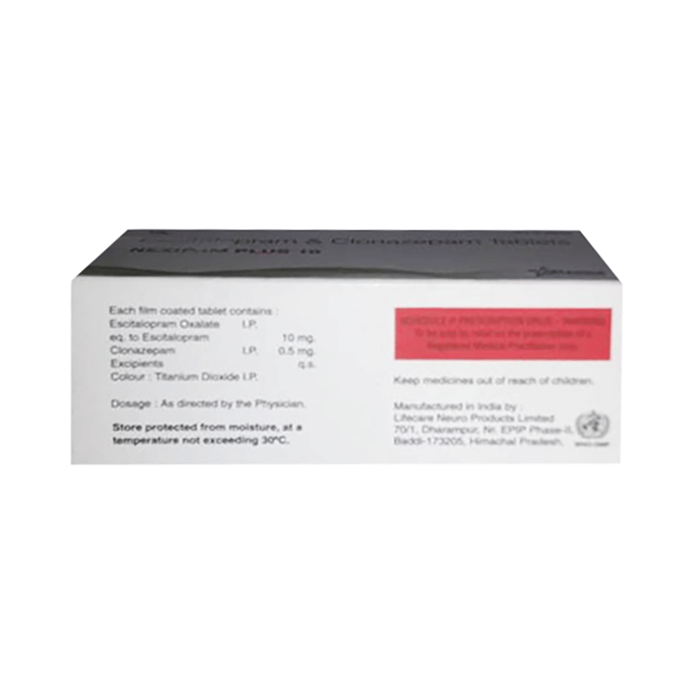 Nexipam Plus 10 Tablet is a prescription medicine used to treat anxiety disorder. It is the combination medicine that calms the brain by decreasing the abnormal and excessive activity of the nerve cells. It also works by increasing the level of a chemical messenger in the brain which improves mood. Nexipam Plus 10 Tablet can be taken with or without food. However, it is advised to take it at the same time each day as this helps to maintain a consistent level of medicine in the body. Take this medicine in the dose and duration advised by your doctor as it has habit-forming potential. If you miss a dose of this medicine, take it as soon as you remember. Finish the full course of treatment even if you feel better. It is important not to stop taking this medicine suddenly as it may cause withdrawal symptoms.Some common side effects of this medicine include delayed ejaculation, low sexual desire, vomiting, memory impairment, depression, and confusion. It may also cause dizziness and sleepiness. So, do not drive or do anything that requires mental focus until you know how this medicine affects you. It may cause weight gain or weight loss depending upon person to person. To prevent weight gain, you can eat a balanced diet and exercise regularly. On the other hand, weight loss can be prevented by increasing food portions in your diet. It is important to inform your doctor if you develop any unusual changes in mood as it can cause suicidal thoughts.Take caution while taking medicine if you are suffering from liver disease. Your doctor should also know about all other medicines you are taking as many of these may make this medicine less effective or change the way it works. Inform your doctor if you are pregnant, planning pregnancy or breastfeeding.