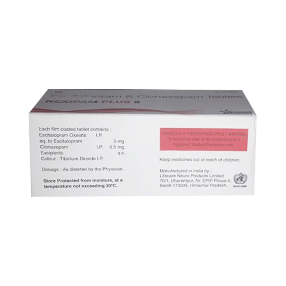 Nexipam Plus 5 Tablet is a prescription medicine used to treat anxiety disorder. It is the combination medicine that calms the brain by decreasing the abnormal and excessive activity of the nerve cells. It also works by increasing the level of a chemical messenger in the brain which improves mood. Nexipam Plus 5 Tablet can be taken with or without food. However, it is advised to take it at the same time each day as this helps to maintain a consistent level of medicine in the body. Take this medicine in the dose and duration advised by your doctor as it has habit-forming potential. If you miss a dose of this medicine, take it as soon as you remember. Finish the full course of treatment even if you feel better. It is important not to stop taking this medicine suddenly as it may cause withdrawal symptoms.Some common side effects of this medicine include delayed ejaculation, low sexual desire, vomiting, memory impairment, depression, and confusion. It may also cause dizziness and sleepiness. So, do not drive or do anything that requires mental focus until you know how this medicine affects you. It may cause weight gain or weight loss depending upon person to person. To prevent weight gain, you can eat a balanced diet and exercise regularly. On the other hand, weight loss can be prevented by increasing food portions in your diet. It is important to inform your doctor if you develop any unusual changes in mood as it can cause suicidal thoughts.Take caution while taking medicine if you are suffering from liver disease. Your doctor should also know about all other medicines you are taking as many of these may make this medicine less effective or change the way it works. Inform your doctor if you are pregnant, planning pregnancy or breastfeeding.