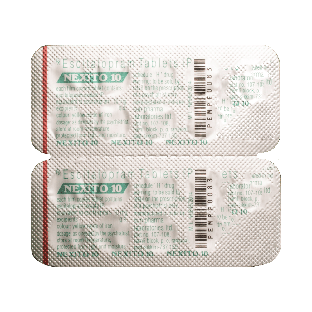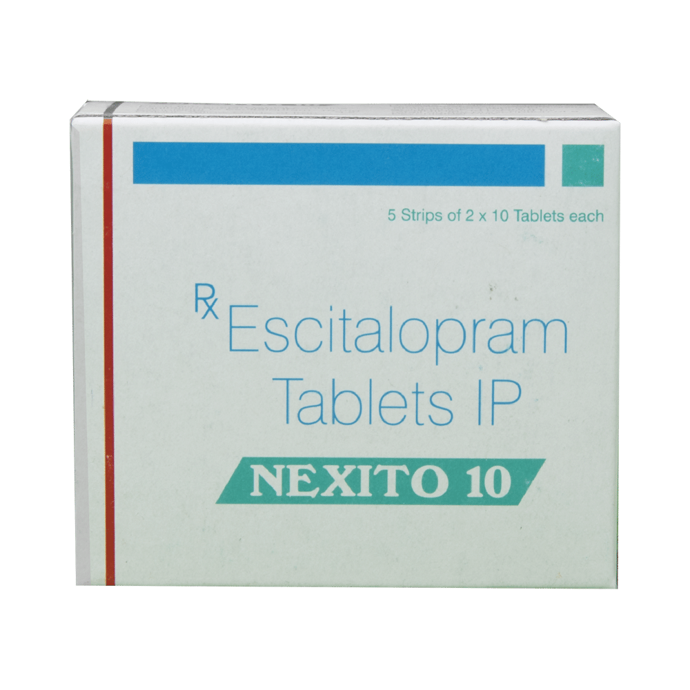 NexITO 10 Tablet is widely prescribed to treat depression and other mental health conditions like anxiety, panic disorder, and obsessive-compulsive disorder. It is a type of antidepressant known as a selective serotonin reuptake inhibitor (SSRI). NexITO 10 Tablet helps recover from depression by improving mood and relieving anxiety and tension. It can be taken with or without food. The dose and how often you need it will be decided by your doctor based on the amount needed to control your symptoms. Your doctor may start you on a lower dose and increase it gradually. Do not change the dose or stop taking it without talking to your doctor, even if you feel well. Doing so may make your condition worse or you may suffer from unpleasant withdrawal symptoms such as anxiety, restlessness, palpitations, dizziness, sleep disturbances.To get the most benefit, take this medicine regularly at the same time each day. Your doctor may advise you to take it in the morning if you have trouble sleeping. It may take a few weeks before you start feeling better. Let your doctor know if you do not see any improvement even after 4 weeks.Some common side effects of this medicine include nausea, fatigue, increased sweating, insomnia (difficulty in sleeping), decreased sexual drive, delayed ejaculation, and women may experience difficulties achieving orgasm. Some people may experience sleepiness after taking this medicine. Let your doctor know straight away if you develop any sudden worsening of mood or any thoughts about harming yourself.Before taking NexITO 10 Tablet, you should tell your doctor if you have epilepsy (seizure disorder or fits), diabetes, liver or kidney disease, any heart problems, or are currently taking medicines for depression known as MAO inhibitors. These may affect your treatment. Please tell your doctor about all the medicines you are taking to make sure you are safe.
