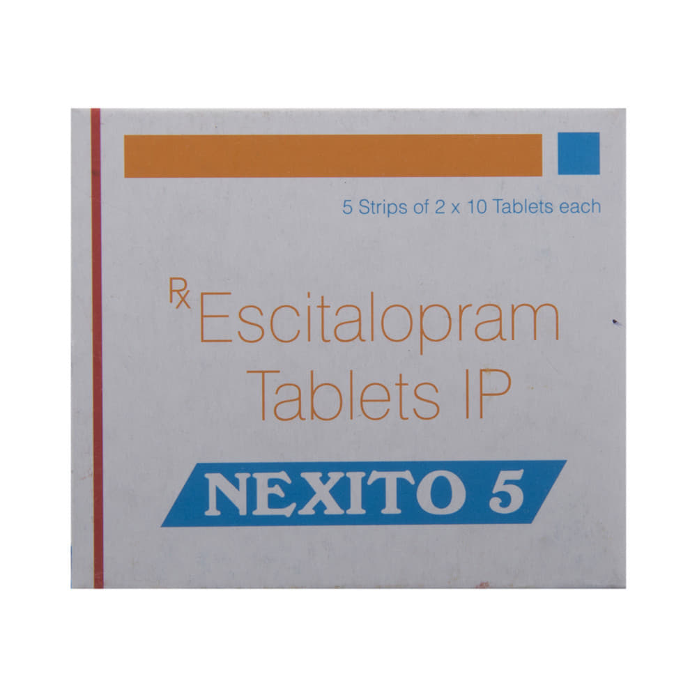 NexITO 5 Tablet is widely prescribed to treat depression and other mental health conditions like anxiety, panic disorder, and obsessive-compulsive disorder. It is a type of antidepressant known as a selective serotonin reuptake inhibitor (SSRI). NexITO 5 Tablet helps recover from depression by improving mood and relieving anxiety and tension. It can be taken with or without food. The dose and how often you need it will be decided by your doctor based on the amount needed to control your symptoms. Your doctor may start you on a lower dose and increase it gradually. Do not change the dose or stop taking it without talking to your doctor, even if you feel well. Doing so may make your condition worse or you may suffer from unpleasant withdrawal symptoms such as anxiety, restlessness, palpitations, dizziness, sleep disturbances.To get the most benefit, take this medicine regularly at the same time each day. Your doctor may advise you to take it in the morning if you have trouble sleeping. It may take a few weeks before you start feeling better. Let your doctor know if you do not see any improvement even after 4 weeks.Some common side effects of this medicine include nausea, fatigue, increased sweating, insomnia (difficulty in sleeping), decreased sexual drive, delayed ejaculation, and women may experience difficulties achieving orgasm. Some people may experience sleepiness after taking this medicine. Let your doctor know straight away if you develop any sudden worsening of mood or any thoughts about harming yourself.Before taking NexITO 5 Tablet, you should tell your doctor if you have epilepsy (seizure disorder or fits), diabetes, liver or kidney disease, any heart problems, or are currently taking medicines for depression known as MAO inhibitors. These may affect your treatment. Please tell your doctor about all the medicines you are taking to make sure you are safe.