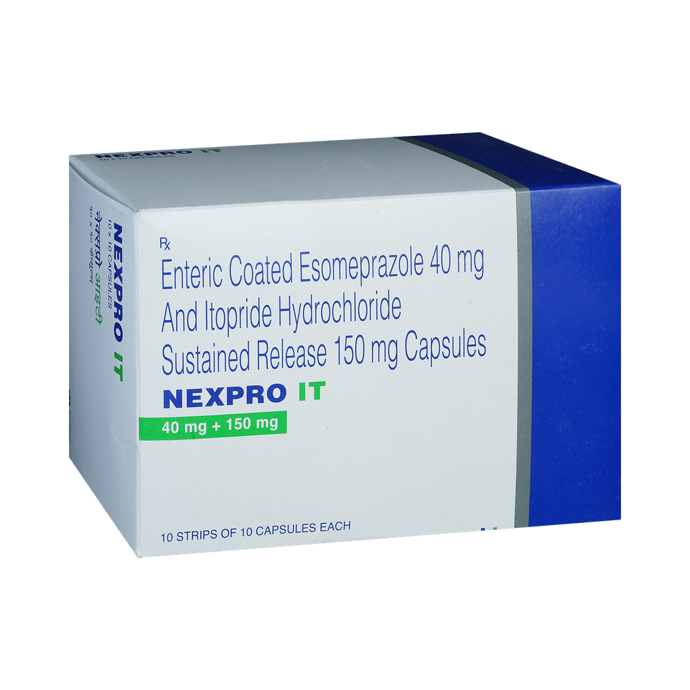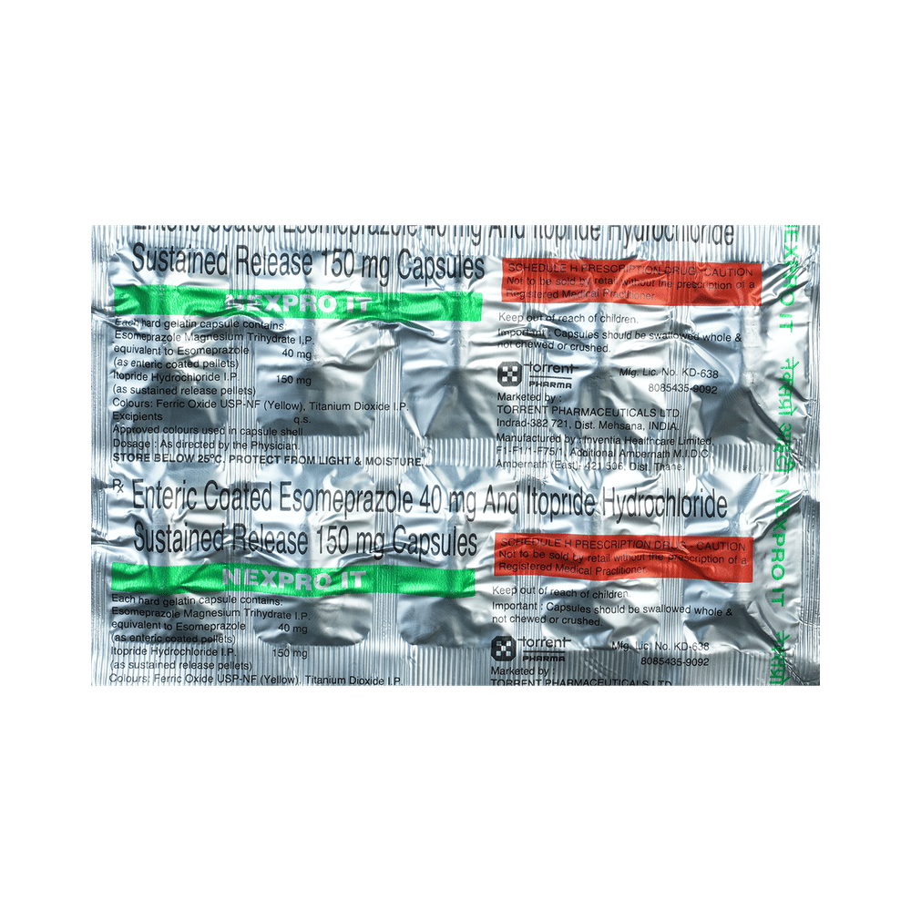 Nexpro IT Capsule SR is a combination medicine used to treat gastroesophageal reflux disease (Acid reflux). It woks by relieving the symptoms of acidity such as heartburn, stomach pain, or irritation. It also neutralizes the acid and promotes easy passage of gas to reduce stomach discomfort. Nexpro IT Capsule SR is taken without food in a dose and duration as advised by the doctor. The dose you are given will depend on your condition and how you respond to the medicine. You should keep taking this medicine for as long as your doctor recommends. If you stop treatment too early your symptoms may come back and your condition may worsen. Let your healthcare team know about all other medications you are taking as some may affect, or be affected by this medicine.The most common side effects include nausea, vomiting, stomach pain, diarrhea, headache, flatulence, and increased saliva production. Most of these are temporary and usually resolve with time. Contact your doctor straight away if you are at all concerned about any of these side effects. This medicine may cause dizziness and sleepiness, so do not drive or do anything that requires mental focus until you know how this medicine affects you. Avoid drinking alcohol while taking this medicine as it can worsen your sleepiness. Lifestyle modifications like having cold milk and avoiding hot tea, coffee, spicy food or chocolate can help you to get better results.Before you start taking this medicine it is important to inform your doctor if you are suffering from kidney or liver disease. You should also tell your doctor if you are pregnant, planning pregnancy or breastfeeding.