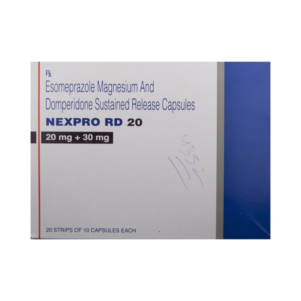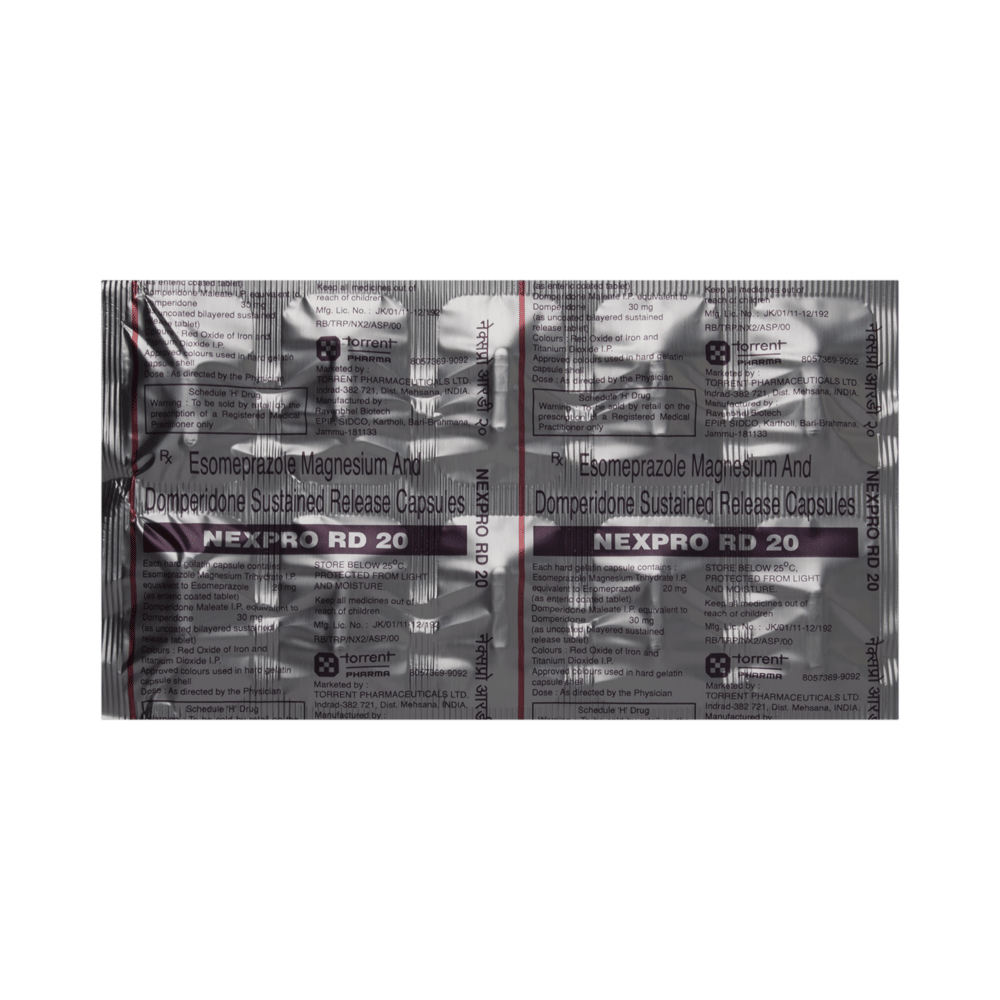Nexpro RD 20 Capsule SR is a prescription medicine used to treat gastroesophageal reflux disease (acid reflux). It helps relieve symptoms such as heartburn, stomach pain, or irritation. It also neutralizes the acid in the stomach and promotes easy gas passage to reduce stomach discomfort. Nexpro RD 20 Capsule SR is best taken on an empty stomach. Take it in the dose and duration advised by the doctor. Continue taking this medicine for as long as your doctor recommends. If you stop treatment too early, your symptoms may come back, and your condition may worsen. Let your doctor know about all other medications you are taking, as some may affect, or be affected by, this medicine.The most common side effects of Nexpro RD 20 Capsule SR include diarrhea, flatulence, stomach pain, dryness in the mouth, and headache. Most of these are temporary and usually resolve with time. Contact your doctor straight away if you are at all concerned about any side effects. It may also cause sleepiness and dizziness, so do not drive or do anything that requires mental focus until you know how this medicine affects you.Before taking this medicine, you should tell your doctor if you are pregnant, planning pregnancy, or breastfeeding. You should also tell your doctor if you have severe liver disease so that your doctor can prescribe a suitable dose for you. Lifestyle modifications like having cold milk and avoiding hot tea, coffee, spicy food, or chocolate can help you get better results.