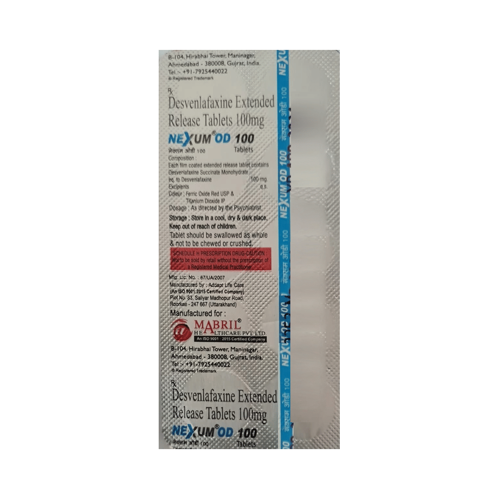 Nexum-OD 100 Tablet ER is a prescription medicine used in the treatment of depression. This medicine helps by increasing the level of chemical messengers (serotonin and noradrenaline) in the brain that have a calming effect on the brain and relaxes the nerves, thus treating your depression. Nexum-OD 100 Tablet ER is taken by mouth with or without food. Take it at a fixed time each day to maintain consistent level of medicine in the blood. In case you have missed a dose, take it as soon as you remember. Do not skip any doses and finish the full course of treatment even if you feel better. It is important that this medication is not stopped suddenly without talking to doctor as this may worsen your symptoms. Some common side effects of this medicine includes nausea, vomiting, insomnia (difficulty in sleeping), and constipation. It may cause an increase in blood pressure, especially during the first month of treatment, monitor your blood pressure regularly. It may even cause dizziness and sleepiness, do not drive or do anything that requires mental focus until you know how this medicine affects you. It is important to inform your doctor if you develop any unusual changes in mood as it may lead to suicidal thoughts.