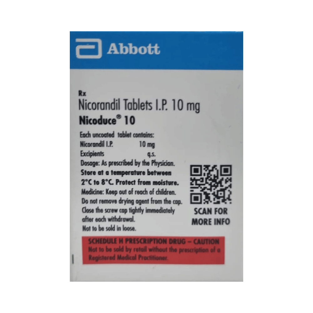 Nicoduce 10 Tablet is a medicine used to prevent and treat heart-related chest pain (angina). It is usually prescribed when other heart medicines are either not suitable or have not worked. It reduces the risk of an angina attack by widening blood vessels and improving blood flow to the heart. Nicoduce 10 Tablet may be taken with or without food. It should be swallowed whole with water. Take this medicine regularly and at about the same time(s) each day. Your doctor will decide the dose and how often you should take it. This may change from time to time depending on how well it is working. Do not stop taking it without talking to our doctor as sudden withdrawal may cause your chest pain to come back. You can improve the health of your heart by making some lifestyle changes such as quitting smoking, cutting down on alcohol, eating well, exercising regularly, and managing stress.The most common side effect of this medicine is headache, especially during the first few days of treatment. This usually improves within a week. However, drinking plenty of fluids and avoiding alcohol may help. Other common side effects include dizziness or weakness, nausea, and flushing (sense of warmth in the face, ears, neck, and trunk). Talk to your doctor if these bother you or do not go away.Nicoduce 10 Tablet may not be suitable for some people. Inform your doctor if you have a history of low blood pressure or heart failure. Also let your doctor know about all other medications that you are using as some may affect, or be affected by this medicine. You should not take any medicines for erectile dysfunction with this medicine. Nicoduce 10 Tablet is not usually recommended during pregnancy or breastfeeding.