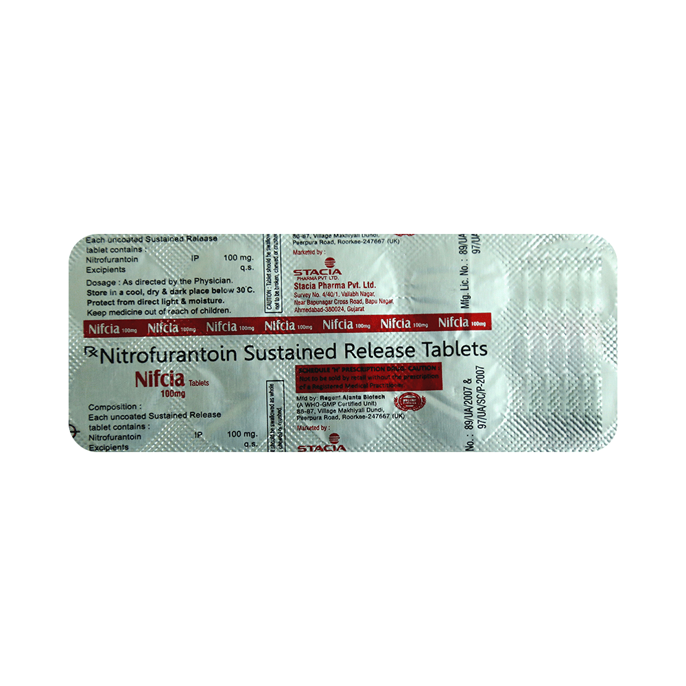 Nifcia 100mg Tablet SR is an antibiotic that fights bacteria. It is used to treat and prevent bacterial infections of the urinary tract. It works by killing the bacteria that cause such disease. But, it will not treat a viral infection. Nifcia 100mg Tablet SR should be taken in the dose and duration as advised by the doctor. You may take it with food to avoid nausea, which is a common side effect. It is better to have this medicine at the same time each day to get the most benefit and you should keep on taking this medicine for as long as you are prescribed it, even if your symptoms quickly improve. If you stop taking it too early the infection may return or worsen.Some people may develop side effects like nausea, vomiting, and diarrhea. These side effects are usually temporary and go away during treatment as your body adjusts to the medicine. Consult your doctor if these side effects bother you or do not go away. This medicine may turn your urine into dark yellow or brown color. But, this is normal and nothing to worry about.Before starting treatment with this medicine, you should tell your doctor if you are pregnant, breastfeeding or suffering from any liver, kidney or heart problems or if you are allergic to any antibiotic.