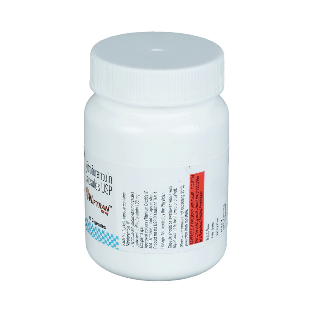 Niftran 100mg Capsule is an antibiotic that fights bacteria. It is used to treat and prevent bacterial infections of the urinary tract. It works by killing the bacteria that cause such disease. But, it will not treat a viral infection. Niftran 100mg Capsule should be taken in the dose and duration as advised by the doctor. You may take it with food to avoid nausea, which is a common side effect. It is better to have this medicine at the same time each day to get the most benefit and you should keep on taking this medicine for as long as you are prescribed it, even if your symptoms quickly improve. If you stop taking it too early the infection may return or worsen.Some people may develop side effects like nausea, vomiting, and diarrhea. These side effects are usually temporary and go away during treatment as your body adjusts to the medicine. Consult your doctor if these side effects bother you or do not go away. This medicine may turn your urine into dark yellow or brown color. But, this is normal and nothing to worry about.Before starting treatment with this medicine, you should tell your doctor if you are pregnant, breastfeeding or suffering from any liver, kidney or heart problems or if you are allergic to any antibiotic.
