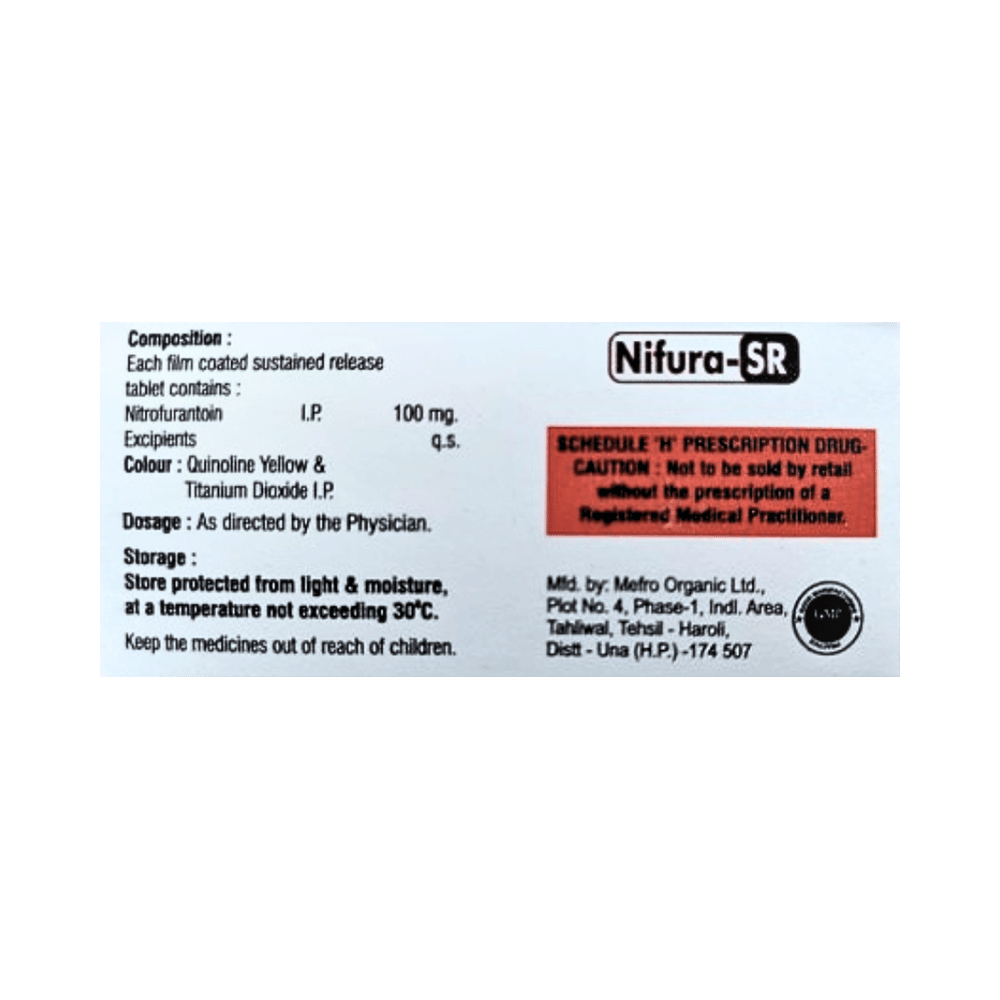 Nifura-SR Tablet is an antibiotic that fights bacteria. It is used to treat and prevent bacterial infections of the urinary tract. It works by killing the bacteria that cause such disease. But, it will not treat a viral infection. Nifura-SR Tablet should be taken in the dose and duration as advised by the doctor. You may take it with food to avoid nausea, which is a common side effect. It is better to have this medicine at the same time each day to get the most benefit and you should keep on taking this medicine for as long as you are prescribed it, even if your symptoms quickly improve. If you stop taking it too early the infection may return or worsen.Some people may develop side effects like nausea, vomiting, and diarrhea. These side effects are usually temporary and go away during treatment as your body adjusts to the medicine. Consult your doctor if these side effects bother you or do not go away. This medicine may turn your urine into dark yellow or brown color. But, this is normal and nothing to worry about.Before starting treatment with this medicine, you should tell your doctor if you are pregnant, breastfeeding or suffering from any liver, kidney or heart problems or if you are allergic to any antibiotic.