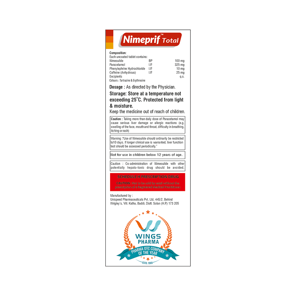 Salt Composition: Nimesulide (100mg) + Paracetamol (325mg) + Phenylephrine (10mg) + Caffeine (25mg)