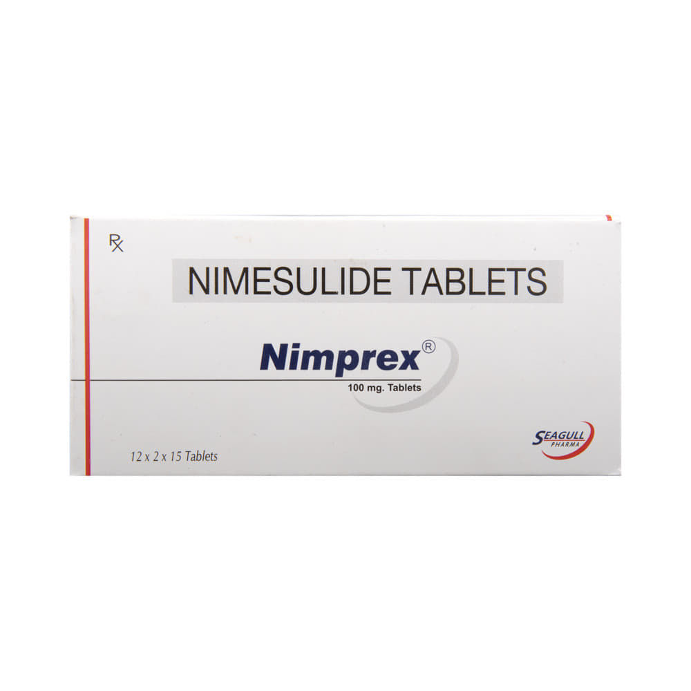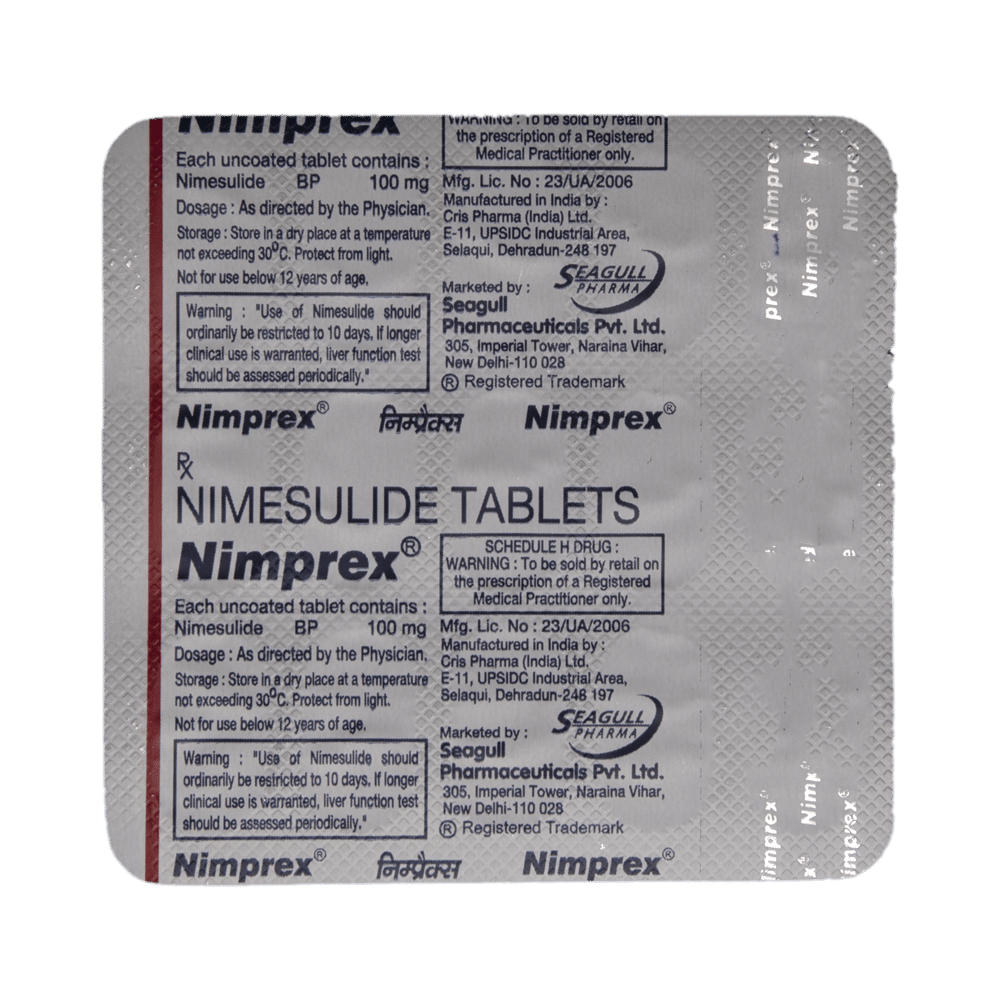 Nimprex Tablet is a pain-relieving medicine. It is taken to treat inflammatory conditions, including joint disorders such as rheumatoid arthritis, postoperative painful conditions, fever, and period pain. Nimprex Tablet should be taken with food. This will prevent you from getting an upset stomach. In general, you should try to use the smallest amount necessary to control your symptoms, for the shortest possible time. You should take this medicine regularly while you need it. Try not to miss doses, as this will make the medicine less effective.Some common side effects of this medicine include diarrhea, nausea, and vomiting. If any of these side effects do not resolve with time or get worse, you should let your doctor know. Your doctor may be able to suggest ways of preventing or reducing the symptoms.To make sure Nimprex Tablet is safe for you, let your doctor know if you have any medical conditions or disorders. You should also tell your doctor all the other medicines you are using or taking. Nimprex Tablet is not recommended for use in pregnant or lactating women and patients with kidney or liver diseases.Note: As per the Ministry of Health and Family Welfare, Nimprex Tablet is banned for children under 12 years of age.