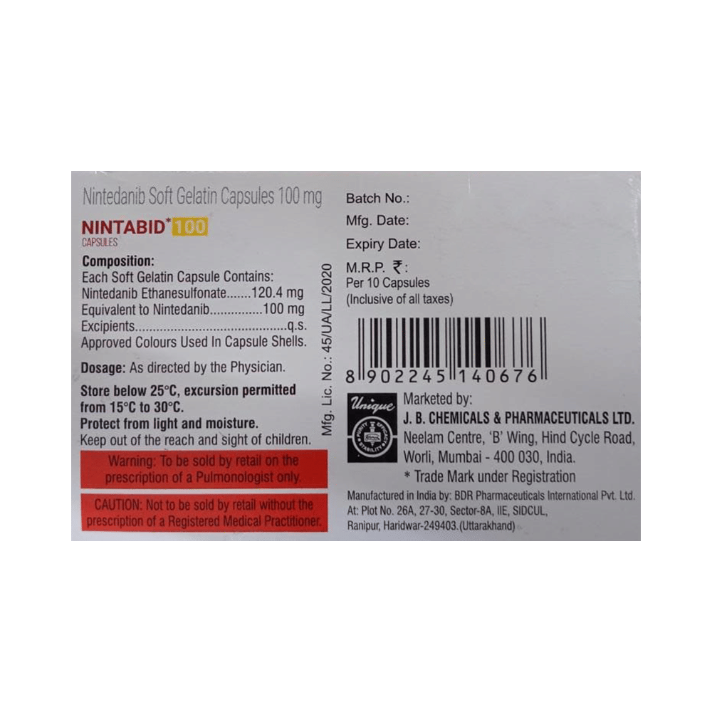 In Treatment of Idiopathic pulmonary fibrosisIdiopathic pulmonary fibrosis is a lung disease caused by lung tissue becoming thick and stiff and eventually forming scar tissue within the lungs. The scarring, or fibrosis, seems to result from a cycle of damage and healing that occurs in the lungs. These changes are irreversible and the affected person may experience shortness of breath or dry cough as initial symptoms. NIntabID 100mg Capsule kills or stops the growth of cancer cells and also prevents the multiplication of cancer cells. You may experience some bothersome side effects. Discuss with your doctor if you have any doubts.In Treatment of Non-small cell lung cancerNon-small cell lung cancer is one of the major kinds of lung cancer and it affects both smokers as well as non-smokers. NIntabID 100mg Capsule helps treat non-small cell lung cancer and may be given alone or in combination with other medicines. It is a potent and very toxic medicine and you should discuss the risks and benefits with your doctor. You should avoid drinking alcohol while having this treatment and drink plenty of water to stay hydrated.show moreshow less
