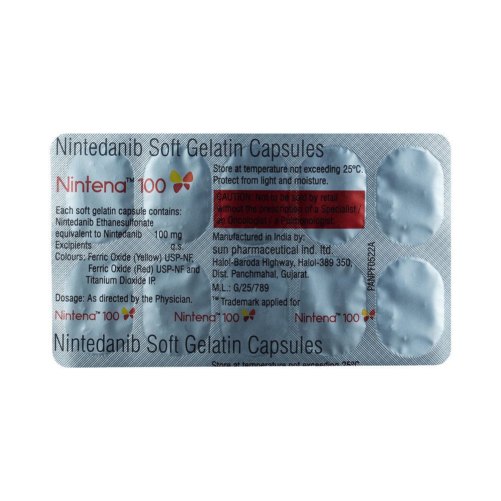 In Treatment of Idiopathic pulmonary fibrosisIdiopathic pulmonary fibrosis is a lung disease caused by lung tissue becoming thick and stiff and eventually forming scar tissue within the lungs. The scarring, or fibrosis, seems to result from a cycle of damage and healing that occurs in the lungs. These changes are irreversible and the affected person may experience shortness of breath or dry cough as initial symptoms. NINtenA 100mg Soft Gelatin Capsule kills or stops the growth of cancer cells and also prevents the multiplication of cancer cells. You may experience some bothersome side effects. Discuss with your doctor if you have any doubts.In Treatment of Non-small cell lung cancerNon-small cell lung cancer is one of the major kinds of lung cancer and it affects both smokers as well as non-smokers. NINtenA 100mg Soft Gelatin Capsule helps treat non-small cell lung cancer and may be given alone or in combination with other medicines. It is a potent and very toxic medicine and you should discuss the risks and benefits with your doctor. You should avoid drinking alcohol while having this treatment and drink plenty of water to stay hydrated.show moreshow less