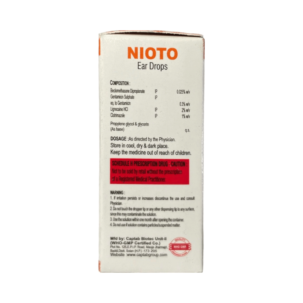 Nioto Ear Drop is a combination of four medicines: Lidocaine, Beclometasone, Clotrimazole and Gentamicin which treat ear infections. Lidocaine is a local anesthetic which works by blocking pain signals from the nerves to brain thereby decreasing the sensation of pain. Beclometasone is a steroid medicine. It blocks the production of certain chemical messengers (prostaglandins) that make the ear red, swollen and itchy after an allergy or infection. Clotrimazole is an antifungal which stops the growth of fungi by preventing them from forming their own protective covering. Gentamicin is an antibiotic which kills bacteria by preventing the synthesis of essential proteins, required by bacteria to carry out vital functions.