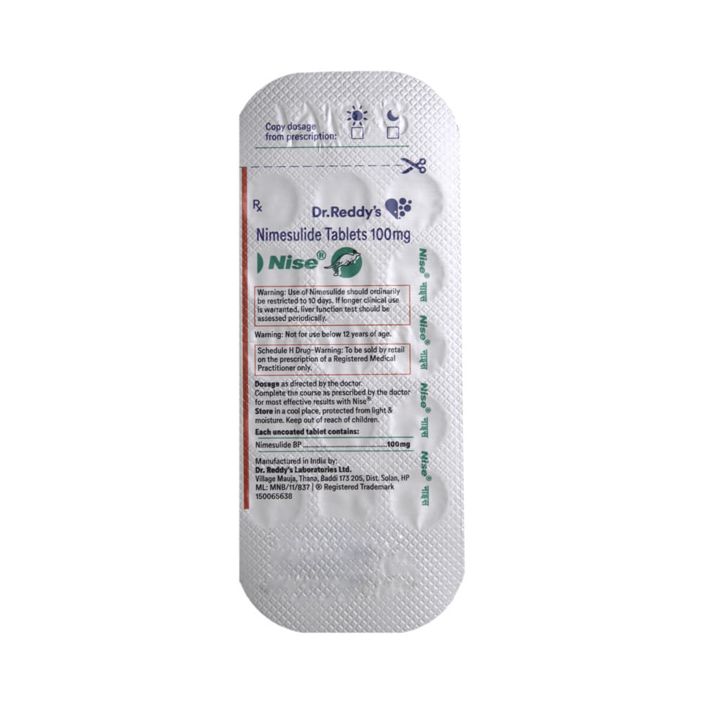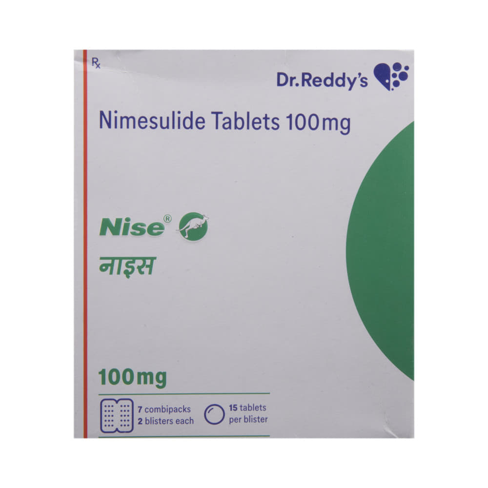 Nise Tablet is a pain-relieving medicine. It is taken to treat inflammatory conditions, including joint disorders such as rheumatoid arthritis, postoperative painful conditions, fever, and period pain. Nise Tablet should be taken with food. This will prevent you from getting an upset stomach. In general, you should try to use the smallest amount necessary to control your symptoms, for the shortest possible time. You should take this medicine regularly while you need it. Try not to miss doses, as this will make the medicine less effective.Some common side effects of this medicine include diarrhea, nausea, and vomiting. If any of these side effects do not resolve with time or get worse, you should let your doctor know. Your doctor may be able to suggest ways of preventing or reducing the symptoms.To make sure Nise Tablet is safe for you, let your doctor know if you have any medical conditions or disorders. You should also tell your doctor all the other medicines you are using or taking. Nise Tablet is not recommended for use in pregnant or lactating women and patients with kidney or liver diseases.Note: As per the Ministry of Health and Family Welfare, Nise Tablet is banned for children under 12 years of age.