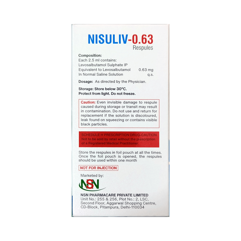 Nisuliv Respules (2.5ml Each) is a belongs to a group of medicines called fast-acting bronchodilators or relievers. It is used to treat the symptoms of asthma and chronic obstructive pulmonary disease (COPD) such as coughing, wheezing, and feeling short of breath. Nisuliv Respules (2.5ml Each) gives quick relief from breathing problems when you need it. In most cases, you will be given another inhaler to prevent your symptoms (a preventer) to u with this. This medicine works quickly and the effects can last several hours. You can take it at any time of day, but only use it when you notice symptoms, such as coughing, wheezing, shortness of breath, and tightness in the chest or you know that you are going to do an activity that can make you breathless. When an asthma attack happens, you should take the number of puffs your doctor recommends. There are several types of inhaler devices so make sure you know how to use your inhaler correctly, otherwise, it may not work. Do not stop using this medicine unless your doctor tells you to. If you stop, your breathing problems could get worse.Common side effects of this medicine include accidental injury, bronchitis, dizziness, pain, pharyngitis, nasal congestion, vomiting, tremors, palpitations, chest pain, and sore throat. These side effects are not often dangerous and they should gradually improve as your body gets used to this medicine. There are other, rarer, side effects and you should call your doctor straight away if you get chest pain, a very bad headache, or very bad dizziness.Before using Nisuliv Respules (2.5ml Each), you should tell your doctor if you have high blood pressure, an overactive thyroid gland, a history of heart problems, diabetes, or low levels of potassium in your blood to make sure it is safe. Also, make sure your doctor knows if you are pregnant or breastfeeding before taking this medicine. Because this medicine can make you feel dizzy or shaky, do not drive, cycle, or use tools or machinery until you feel better. You should not smoke as it causes damage to your lungs and will make your condition worse.