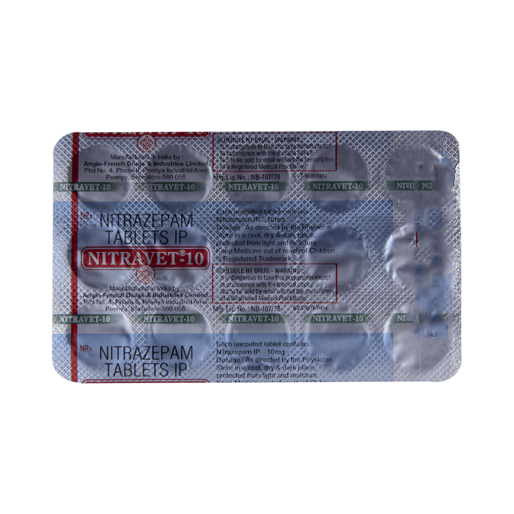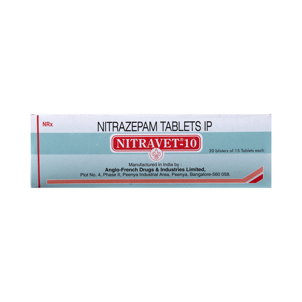Nitravet 10 Tablet is used for treating insomnia. It is generally used in combination with other medicines. It relaxes the brain and helps to treat people who have problems with their sleeping habits. Nitravet 10 Tablet may be taken with or without food. However, take it at the same time each day as this helps to maintain a consistent level of medicine in the body. Take this medicine in the dose and duration as advised by your doctor as it has a high potential of habit-forming.If you have missed a dose, take it as soon as you remember and finish the full course of treatment even if you feel better. It is important that this medication is not stopped suddenly without talking to your doctor as it may cause nausea and anxiety. It should only be used for a limited period as long-term use of this medicine is not recommended.Nitravet 10 Tablet may cause dizziness and drowsiness as side effects, so do not drive if you have taken this medicine. Moreover, driving under the influence of this medicine is also considered as an offense. Other common side effects of this medicine include sedation, unsteadiness, impaired coordination, numbed emotions, reduced alertness, and fatigue. These are usually temporary and resolve on their own. Consult your doctor if these side effects bother you or do not go away.It should be noted that in elderly patients this medicine may reduce muscle tone and increased the risk of falls. You should avoid alcohol intake while taking this medicine as it will increase drowsiness.