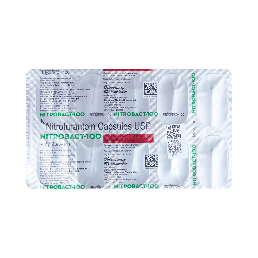 Nitrobact 100 Capsule is an antibiotic that fights bacteria. It is used to treat and prevent bacterial infections of the urinary tract. It works by killing the bacteria that cause such disease. But, it will not treat a viral infection. Nitrobact 100 Capsule should be taken in the dose and duration as advised by the doctor. You may take it with food to avoid nausea, which is a common side effect. It is better to have this medicine at the same time each day to get the most benefit and you should keep on taking this medicine for as long as you are prescribed it, even if your symptoms quickly improve. If you stop taking it too early the infection may return or worsen.Some people may develop side effects like nausea, vomiting, and diarrhea. These side effects are usually temporary and go away during treatment as your body adjusts to the medicine. Consult your doctor if these side effects bother you or do not go away. This medicine may turn your urine into dark yellow or brown color. But, this is normal and nothing to worry about.Before starting treatment with this medicine, you should tell your doctor if you are pregnant, breastfeeding or suffering from any liver, kidney or heart problems or if you are allergic to any antibiotic.