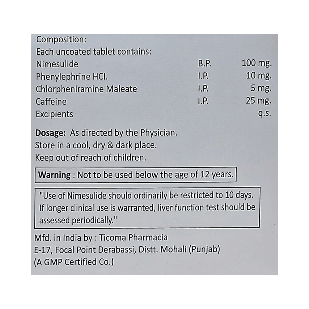 Salt Composition: Phenylephrine (10mg) + Nimesulide (10mg) + Chlorpheniramine Maleate (5mg) + Caffeine (25mg)