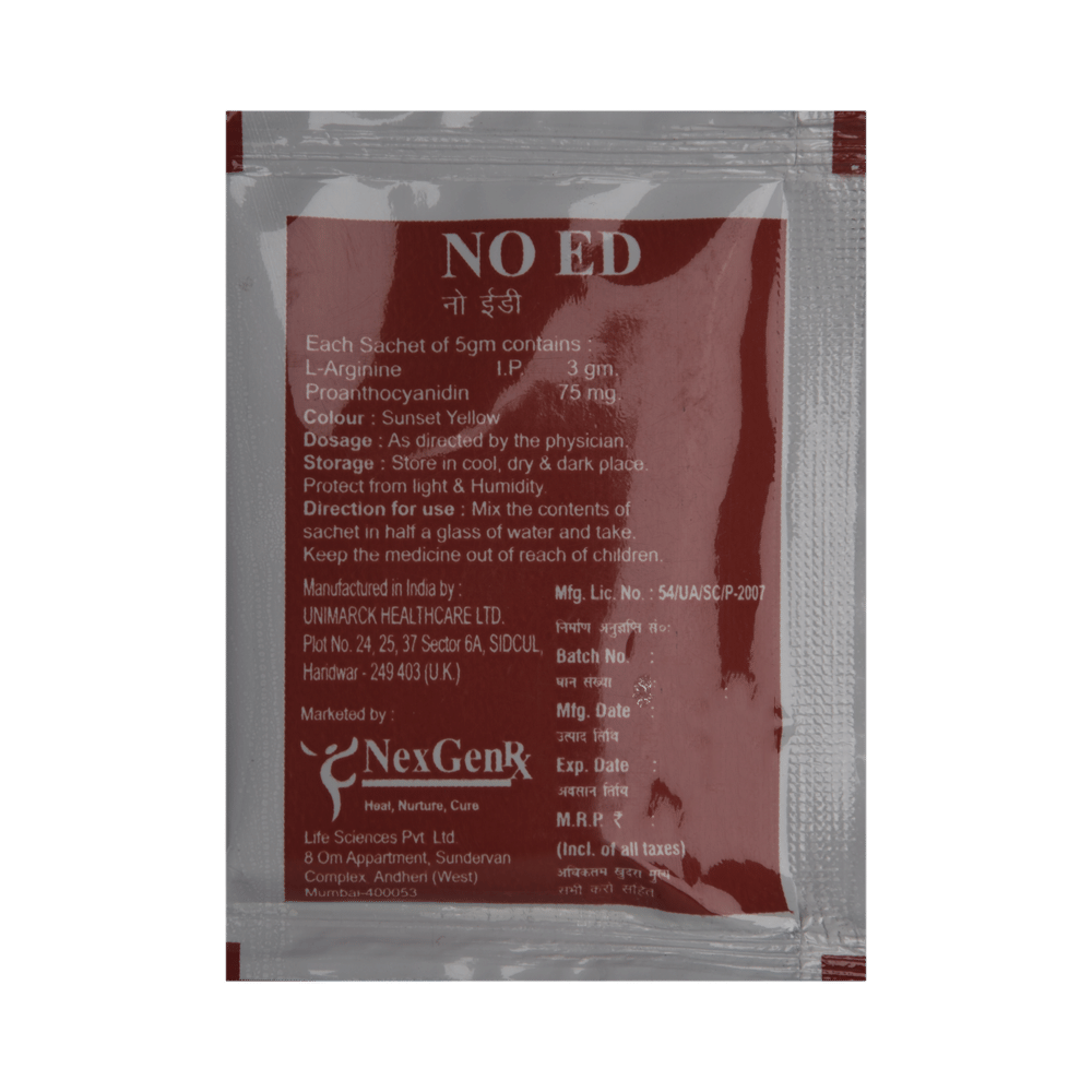 NO ED Sachet Sugar Free is a nutritional supplement. It is taken to treat conditions caused by nutritional deficiencies such as vitamins, minerals, and other nutrients in the body. It provides essential nutrients to our body and ensures proper growth and helps improve overall health. NO ED Sachet Sugar Free may be taken with or without food. Take it in the dose and duration advised by the doctor. To get the most benefit, take it regularly at the same time each day and continue taking it until your prescription is finished. Do not take it more than or longer than prescribed by the doctor, as that may cause harmful effects.It is generally safe medicine with little or no side effects. However, if you experience any symptom which you think is caused by the medicine, let your doctor know. They may be able to suggest ways to reduce or prevent the side effects.Before taking this medicine, it is important to let your doctor know if you have any preexisting medical conditions or if you are taking any other medications. This will ensure your safety to use this medicine. Pregnant and breastfeeding should consult their doctor before taking this medicine to make sure it is safe for them.