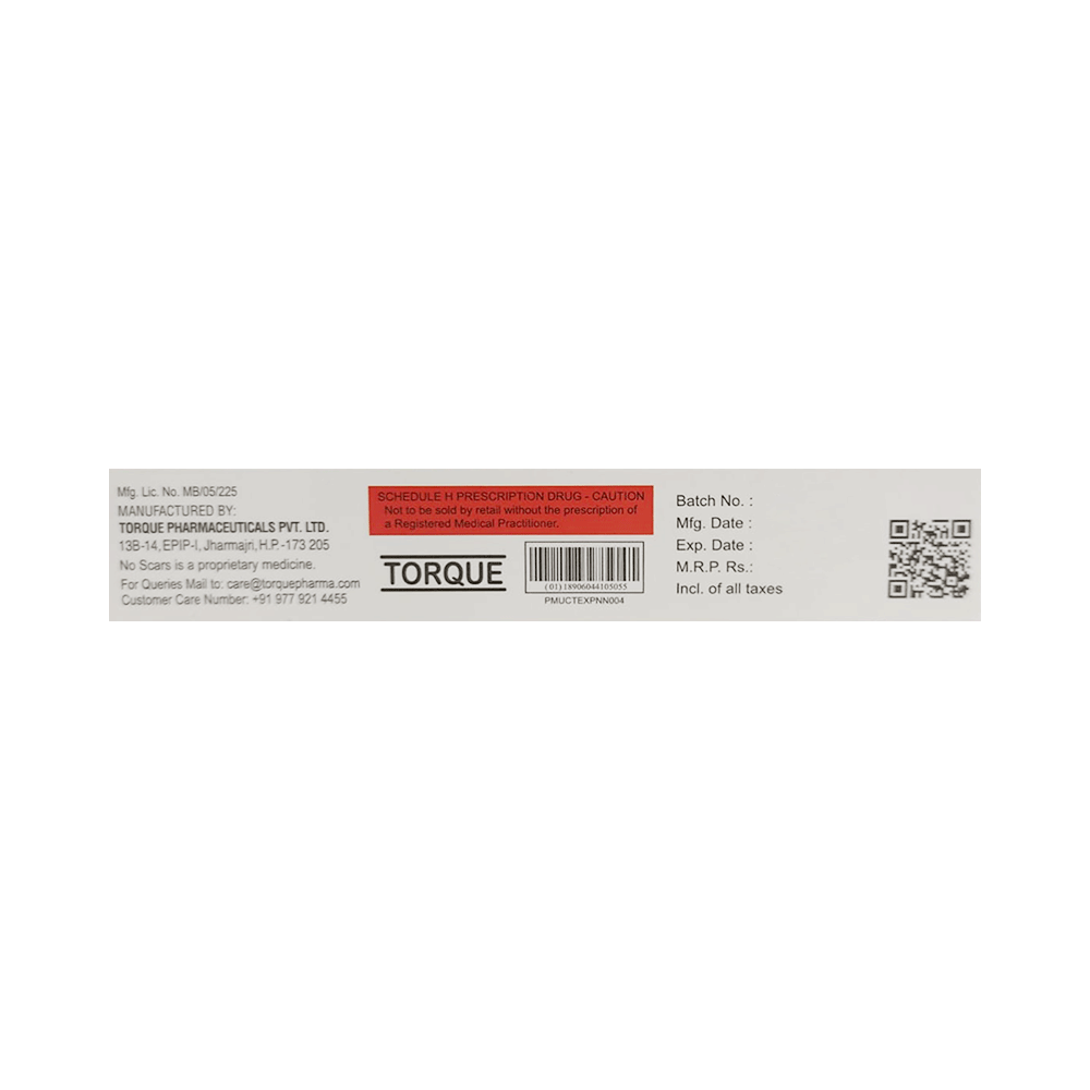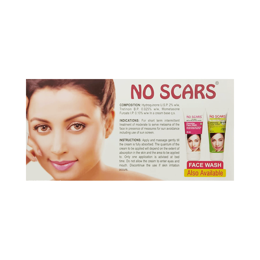 NO SCARS Cream is a prescription medicine used in the treatment of melasma. It helps in quick skin renewal. It provides relief from redness, swelling, and itching. NO SCARS Cream should be used in the dose and duration as advised by your doctor. Wash your hands before using this medicine. It is advised to check the label for directions before use. It is for external use only.Do not use this medicine more than the recommended dose. Inform your doctor if you have known allergies from this medicine. The common side effects of this medicine include burning, irritation, itchiness, and redness at the application site.If these side effects or any other symptoms which you think are because of this medicine persist for a longer duration, please consult your doctor. Inform your doctor if you are pregnant or are suffering from any other disease. This medicine is not safe to use in breastfeeding mothers.