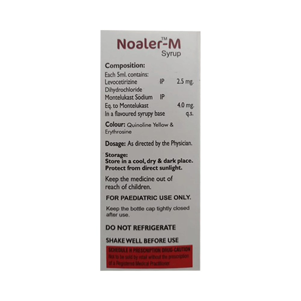 Noaler-M Syrup is commonly prescribed in children to treat symptoms of allergy such as runny nose, sneezing, itching, swelling, congestion, and watery eyes. It may also help in the treatment of asthma and skin allergies. Give this medicine to your child at a fixed time before or after food in the prescribed dose, time, and way. For asthma, prefer giving Noaler-M Syrup in the evening or 2 hours before physical activity. For allergy, it is best to give it either in the morning or in the evening, depending upon the time of onset of symptoms. In case your child has both, prefer giving it in the evening. If your child vomits within 30 minutes of taking this medicine, give the same dose again, but skip it if it’s already time for the next dose.Your child may start to feel better after a few regular doses. However, you must still complete the prescribed dose to ensure maximum benefit. Moreover, stopping the medicine abruptly may worsen your child’s condition. This medicine may cause some minor and temporary side effects like vomiting, diarrhea, nausea, dizziness, dry mouth, rash, and headache. Usually, these episodes subside once your child’s body adapts to the medicine. However, in case these effects persist or start bothering your child, consult your child’s doctor without any delay.Let your child’s doctor know if your child is already taking any medicines. Also, narrate your child’s complete medical history, including any prior episodes of allergy, heart problem, blood disorder, vascular disorders, birth defects, airway obstruction, lung anomaly, skin disorder, liver impairment, and kidney malfunction. This information is critical for dose alterations and in planning your child’s overall treatment.
