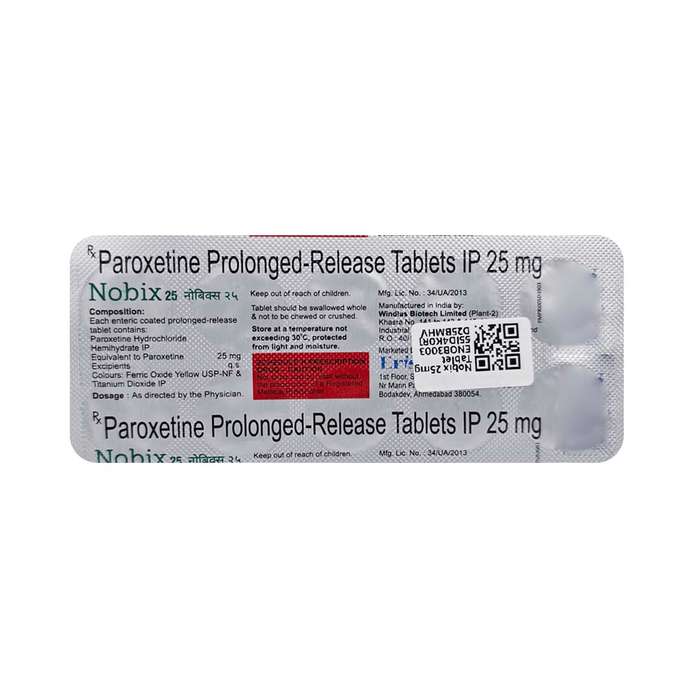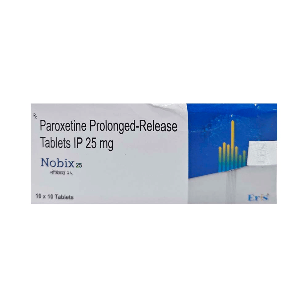 Nobix 25mg Tablet is a type of antidepressant belonging to the selective serotonin reuptake inhibitor (SSRI) group of medicines. It is widely prescribed to treat depression and anxiety-related conditions like obsessive-compulsive disorder, and panic disorder. Nobix 25mg Tablet helps many people to recover from depression by improving their mood and relieving anxiety and tension. It can be taken with or without food. The dose and how often you need it will be decided by your doctor so that you get the right amount to control your symptoms.Your doctor may start you on a lower dose and increase it gradually. Do not change the dose or stop taking it without talking to your doctor, even if you feel well. Doing so may make your condition worse or you may suffer from unpleasant withdrawal symptoms (anxiety, restlessness, palpitations, dizziness, sleep disturbances, etc).To get the most benefit, take this medicine regularly at the same time each day. Your doctor may advise you to take it in the morning if you have trouble sleeping. It may take a few weeks before you start feeling better. Let your doctor know if you do not see any improvement even after 4 weeks.Some common side effects of Nobix 25mg Tablet include nausea, fatigue, dry mouth, loss of appetite, increased sweating, dizziness, nervousness, tremors, insomnia (difficulty in sleeping), and constipation. Sexual side effects like decreased sexual drive, delayed ejaculation, and erectile dysfunction may also be seen. Let your doctor know straight away if you develop any sudden worsening of mood or any thoughts about harming yourself.Before taking this medicine, you should tell your doctor if you have epilepsy (seizure disorder or fits), diabetes, liver or kidney disease, heart problems, or glaucoma. These may affect your treatment. Pregnant or breastfeeding women should also consult their doctor before taking it. Some other medicines may affect the way it works, especially other antidepressants and medicines called MAO inhibitors. Please tell your doctor about all the medicines you are taking to make sure you are safe.