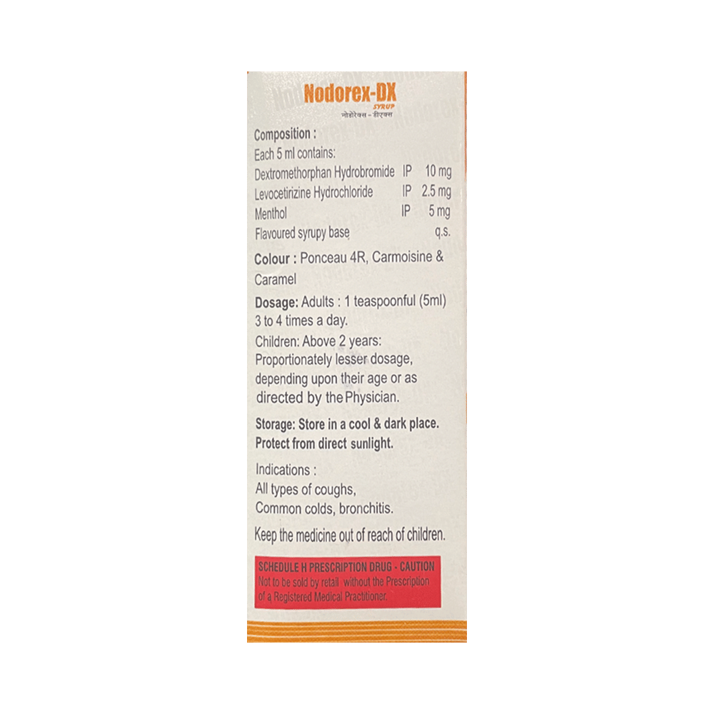 Nodorex-DX Syrup Sugar Free is a combination of dextromethorphan hydrobromide, menthol, and levocetirizine hydrochloride. Dextromethorphan hydrobromide suppresses cough by reducing the activity of the cough center in the brain. Levocetirizine hydrochloride is antihistaminic medication that treats allergy symptoms such as runny nose, watery eyes, and sneezing by blocking the effects of a chemical messenger (histamine) in the body. Menthol works by producing a mild anesthetic action that relieves irritation and provides cooling sensation.