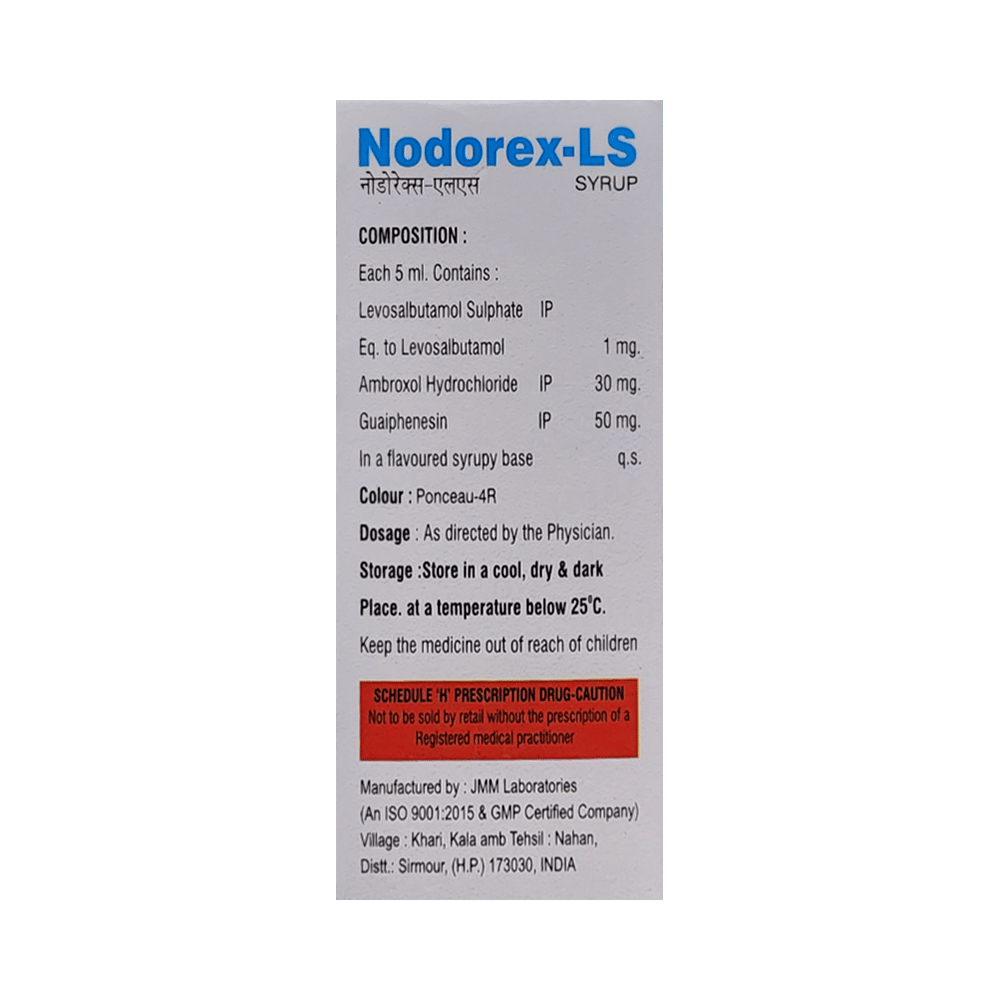 Nodorex-LS Strawberry Sugar Free Syrup is a combination medicine used in the treatment of cough with mucus. It thins mucus in the nose, windpipe, and lungs, making it easier to cough out. It also provides relief from runny nose, sneezing, itching, and watery eyes. Nodorex-LS Strawberry Sugar Free Syrup is taken with or without food in a dose and duration as advised by the doctor. The dose you are given will depend on your condition and how you respond to the medicine. You should keep taking this medicine for as long as your doctor recommends. If you stop treatment too early your symptoms may come back and your condition may worsen. Let your healthcare team know about all other medications you are taking as some may affect, or be affected by this medicine.The most common side effects are nausea, diarrhea, stomach pain, vomiting, muscle cramp, headache, skin rash, and increased heart rate. Most of these are temporary and usually resolve with time. Contact your doctor straight away if you are at all concerned about any of these side effects. This medicine can also cause sleepiness, so do not drive or do anything that requires mental focus until you know how this medicine affects you. Avoid drinking alcohol while taking this medicine as it can make sleepiness worse.Never support self-medication or recommend your medicine to another person. It is beneficial to have plenty of fluids while taking this medication. Before taking this medicine, you should tell your doctor if you are pregnant, planning pregnancy, or breastfeeding. You should also tell your doctor if you have any kidney or liver diseases so that your doctor can prescribe a suitable dose for you.