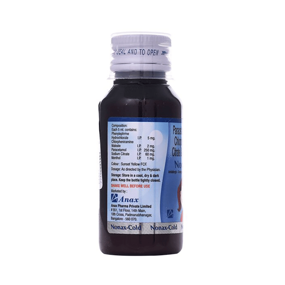 Nonax-Cold Oral Suspension is a medicine used in the treatment of common cold symptoms. It provides relief from symptoms such as headache, sore throat, runny nose, muscular pain, and fever. Nonax-Cold Oral Suspension can be taken with or without food. The dose and duration will depend on the severity of your condition. You should keep taking the medicine even if you feel better until the doctor says it is alright to stop using it.Using this medicine may cause a few common side effects such as nausea, vomiting, sleepiness, dizziness, and headache. If any of these side effects do not resolve with time or get worse, you should let your doctor know. Your doctor may be able to suggest ways of preventing or reducing the side effects. In general, you should try to use the smallest amount necessary to control your symptoms.Before using the medicine, you should tell your doctor if you have any other medical conditions or disorders. To make sure it is safe, you should let your doctor know all the other medicines you are taking. Also, tell your doctor if you have any problems with the liver or kidneys. Avoid consumption of alcohol while on treatment with this medicine as it may increase the chance of some side effects. Pregnant and breastfeeding women should consult their doctors first before using the medicine.