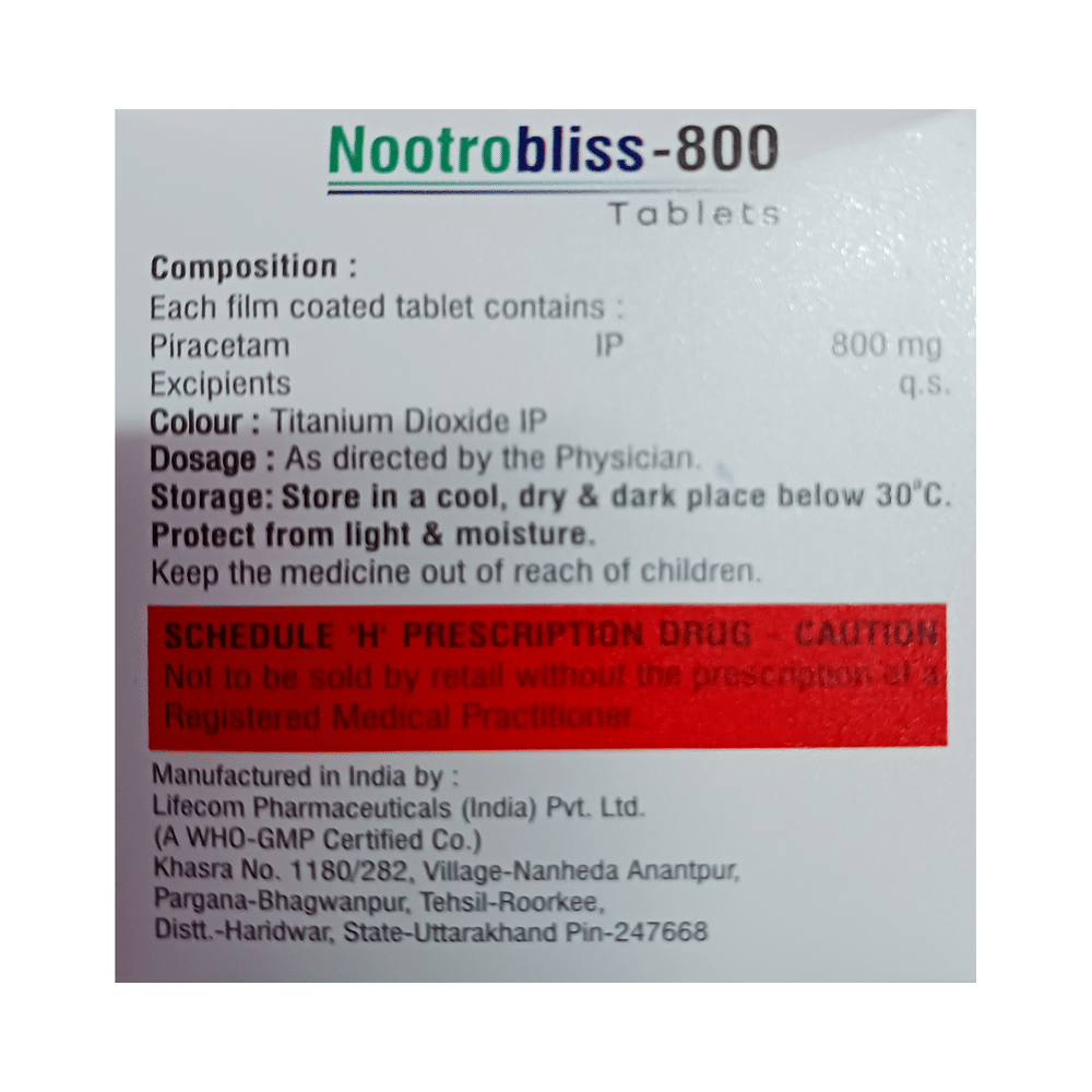 Nootrobliss 800 Tablet is used in the treatment of memory loss in Alzheimer's disease. It can also be used to treat age-related and post-traumatic memory loss. It works by improving communication between the nerve cells and protects the brain. Nootrobliss 800 Tablet is sometimes used to help manage sickle cell disease. It can reduce the number of painful episodes called vaso-occlusive crises by improving blood flow and preventing blood cells from sticking together.Nootrobliss 800 Tablet should be taken by mouth with or without food. It is advisable to take this medicine at the same time each day to maintain a consistent level in the blood. Do not skip any doses and finish the full course of treatment even if you feel better. This medication mustn't be stopped suddenly, as it may result in twitching or jerking movements, and even relapse of the disease may occur.Some common side effects of this medicine include nervousness and abnormality of voluntary movements. It may also cause dizziness and sleepiness, so do not drive or do anything that requires mental focus. This medicine may cause weight gain; therefore, you should have a balanced diet and exercise regularly.This medicine can affect platelet aggregation, so inform your doctor if you have bleeding problems or if you are on medications that help make blood thin. Pregnant and breastfeeding women should consult their doctors before taking this medicine.
