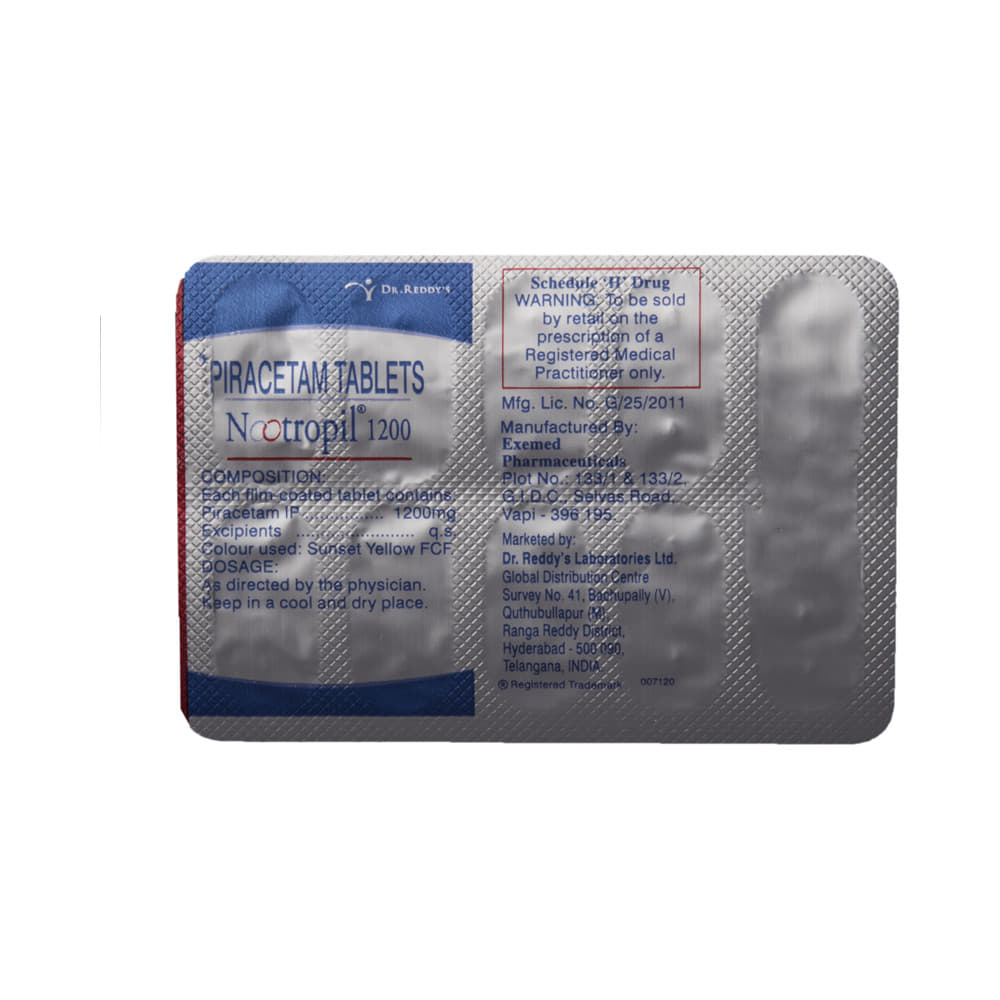 Nootropil 1200 Tablet is used in the treatment of memory loss in Alzheimer's disease. It can also be used to treat age-related and post-traumatic memory loss. It works by improving communication between the nerve cells and protects the brain. Nootropil 1200 Tablet is sometimes used to help manage sickle cell disease. It can reduce the number of painful episodes called vaso-occlusive crises by improving blood flow and preventing blood cells from sticking together.Nootropil 1200 Tablet should be taken by mouth with or without food. It is advisable to take this medicine at the same time each day to maintain a consistent level in the blood. Do not skip any doses and finish the full course of treatment even if you feel better. This medication mustn't be stopped suddenly, as it may result in twitching or jerking movements, and even relapse of the disease may occur.Some common side effects of this medicine include nervousness and abnormality of voluntary movements. It may also cause dizziness and sleepiness, so do not drive or do anything that requires mental focus. This medicine may cause weight gain; therefore, you should have a balanced diet and exercise regularly.This medicine can affect platelet aggregation, so inform your doctor if you have bleeding problems or if you are on medications that help make blood thin. Pregnant and breastfeeding women should consult their doctors before taking this medicine.