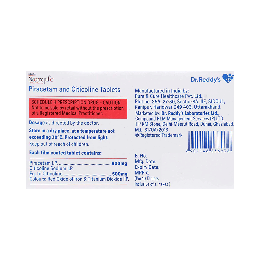 Take this medicine in the dose and duration as advised by your doctor. Swallow it as a whole. Do not chew, crush or break it. Nootropil C Tablet may be taken with or without food, but it is better to take it at a fixed time.