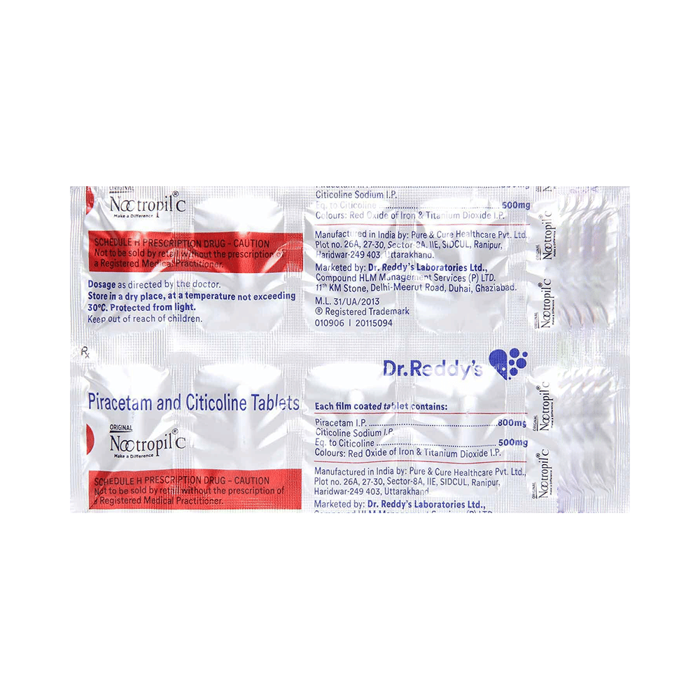 Nootropil C Tablet is a combination of two medicines: Citicoline and Piracetam. Citicoline is a nerve protecting medicine. It works on the brain by nourishing the nerve cells, protects them from damage and improves their survival. Piracetam is a GABA (gamma amino butyric acid) analogue. It works by protecting the brain and nervous system against shortness of oxygen and also affects various ion channels on nerve cell membrane.