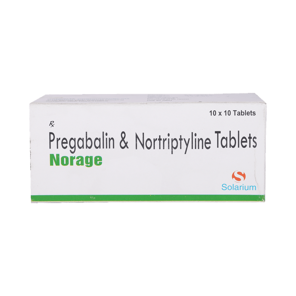 Norage 75mg/10mg Tablet is a combination medicine used for the treatment of neuropathic pain. This medicine decreases the pain by stopping the movement of pain signals to the brain. Norage 75mg/10mg Tablet may be taken with or without food, preferably at bedtime. Take it at the same time each day as this helps to maintain a consistent level of medicine in the blood. Take this medicine in the dose and duration advised by your doctor. If you miss a dose of this medicine, take it as soon as you remember. Finish the complete course of treatment even if you feel better. Do not stop this medication suddenly without talking to the doctor.Some common side effects of this medicine include constipation, nausea, vision disturbance, and excessive sweating. It may also cause dizziness and sleepiness. So, do not drive or do anything that requires mental focus until you know how this medicine affects you. This medicine may cause weight gain, and to control it, you should exercise regularly and have a balanced diet. It is important to inform your doctor if you develop any unusual changes in mood or behavior, new or worsening depression, or suicidal thoughts.Before taking Norage 75mg/10mg Tablet, let your doctor know if you suffer from kidney or liver disease. Your doctor should also know about all other medicines you are taking, as many of these may make this medicine less effective or change the way it works. Inform your doctor if you are pregnant, planning pregnancy, or breastfeeding.