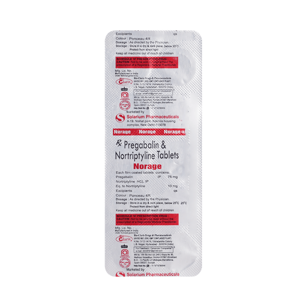Norage 75mg/10mg Tablet is a combination of two medicines: Pregabalin and Nortriptyline. Pregabalin is an alpha-2 delta ligand that decreases pain by modulating the calcium channel activity of the nerve cells. Nortriptyline is a tricyclic antidepressant that increases the levels of chemical messengers (serotonin and noradrenaline) that stop the movement of pain signals in the brain. Together, they relieve neuropathic pain (pain from damaged nerves).