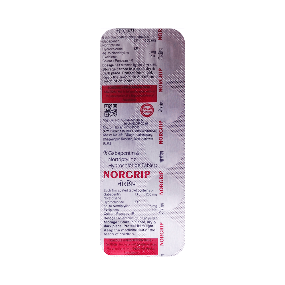 Norgrip Tablet is a combination of two medicines: Gabapentin and Nortriptyline. Gabapentin is an alpha 2 delta ligand which decreases the pain by modulating calcium channel activity of the nerve cells. Nortriptyline is a tricyclic antidepressant which increases the levels of chemical messengers (serotonin and noradrenaline) that stop the movement of pain signals in the brain. Together, they relieve neuropathic pain (pain from damaged nerves).