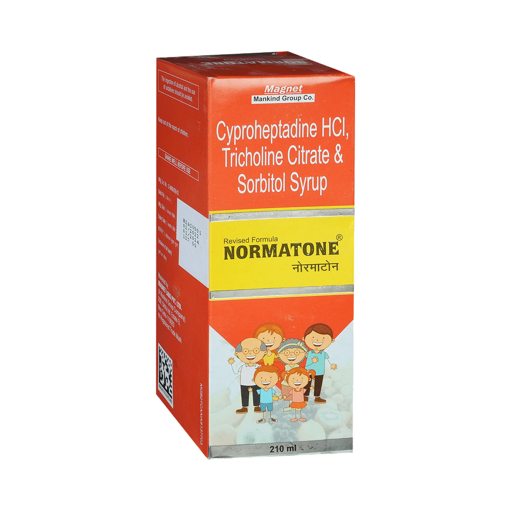 Normatone Syrup is a combination of three medicines: Cyproheptadine, tricholine citrate and sorbitol, which revives appetite. Cyproheptadine is an appetite-stimulant. It works by reducing the effect of a chemical messenger (serotonin) in the hypothalamus, a part of the brain which regulates appetite. Tricholine citrate is a bile acid binding agent which removes bile acids from the body. The liver then produces more bile acids using cholesterol, as a result of which cholesterol level is lowered. Sorbitol acts as a syrup base and also as an osmotic laxative to relieve constipation.