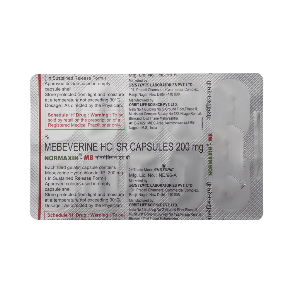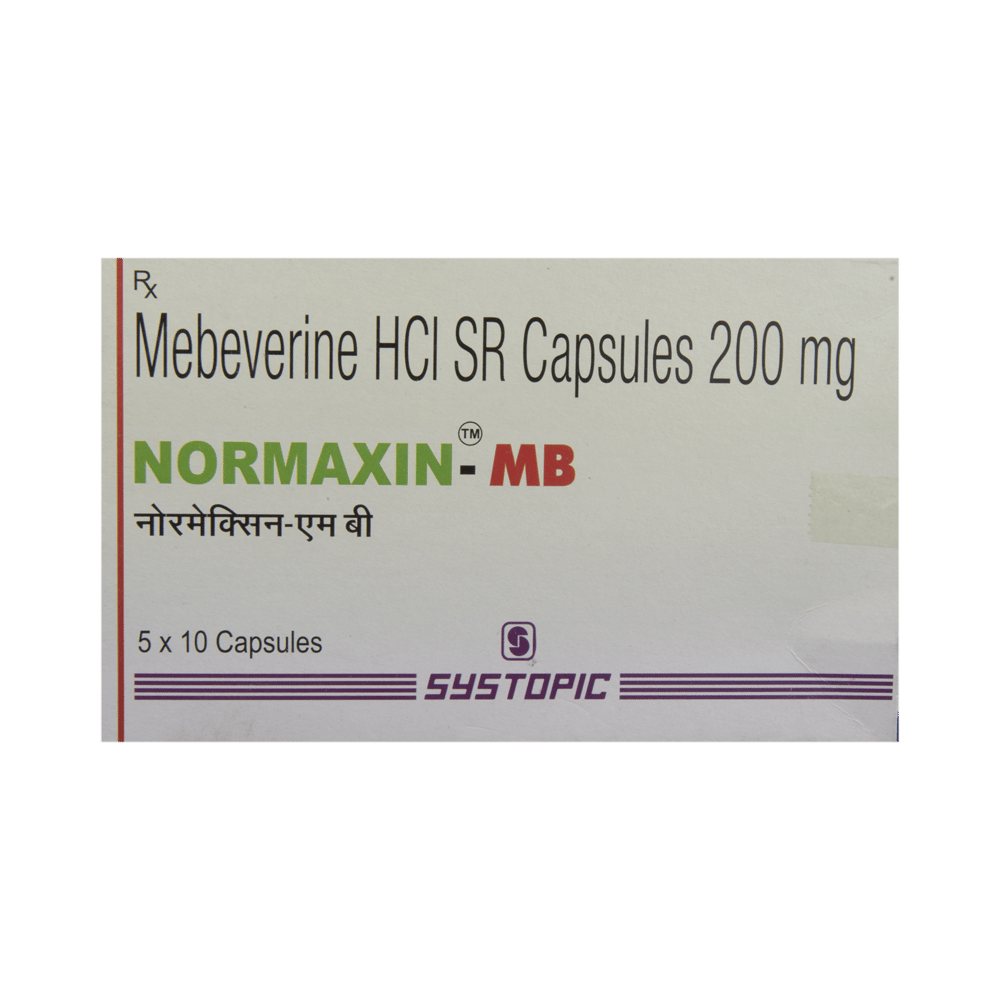 Normaxin-MB Capsule SR is a prescription medicine used to treat and relieve symptoms of irritable bowel syndrome such as stomach pain and spasm, cramps in the abdomen, gas, bloating, and changes in bowel habits. This medicine relaxes muscles of the intestine and relieves spasms. Normaxin-MB Capsule SR should be taken in a dose and duration as advised by your doctor. It is swallowed whole with a drink of water preferably 20 minutes before a meal to relieve or reduce post-meal symptoms. Let your doctor know about all other medications you are taking as some may affect, or be affected by this medicine. You should keep taking this medicine for as long as your doctor recommends. If you stop treatment too early your symptoms may come back and your condition may worsen. Remember following lifestyle modifications like having a fiber-rich diet, increase fluid intake and regular exercise can help you to get better results.This medicine has very less or minimal side effects but it may cause skin rash, fainting, or angioedema sometimes. Be cautious as it is important to stop the medication and inform the doctor if you encounter difficulty in breathing or swelling of the face, neck, tongue, or throat.Before taking this medicine, you should let your doctor know if you have liver and kidney problems. Pregnant or breastfeeding women should also consult their doctor before taking this medicine.