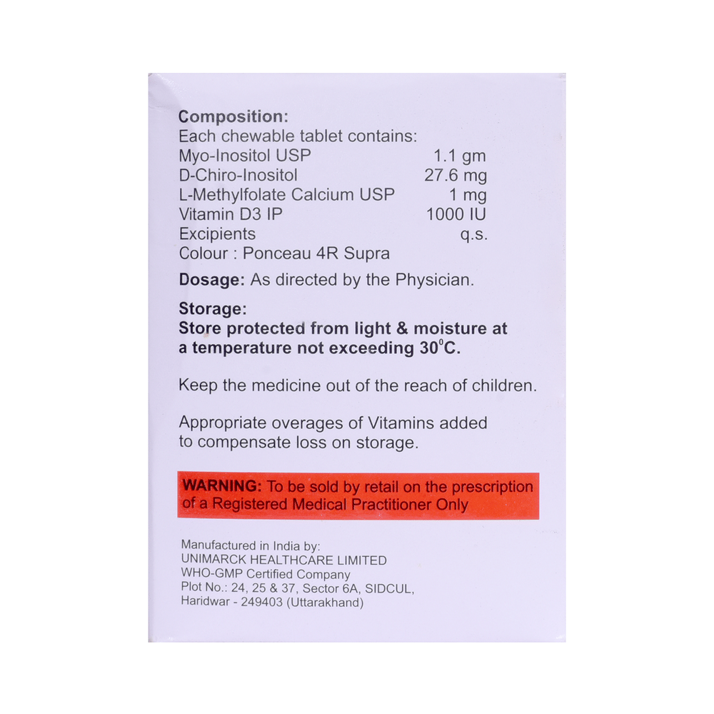 Salt Composition: Myo-Inositol (1.1gm) + D-Chiro Inositol (27.6mg) + L-Methyl Folate Calcium (1mg) + Vitamin D3 (1000IU)