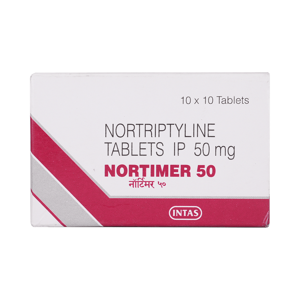 Nortimer 50mg Tablet is a tricyclic antidepressant that is used to treat depression and nighttime bedwetting (nocturnal enuresis). Additionally, it may also be prescribed for neuropathic pain. Nortimer 50mg Tablet works by increasing the levels of chemical messengers in the brain that stabilizes and enhances the mood. It is better to take it before bedtime because it can make you feel drowsy. It can be taken with or without food, but you should take it at a fixed time each day for better efficacy. The dose and duration will be decided by your doctor so that you get the right amount to control your symptoms. The most common side effects of this medicine include increased heart rate, blurred vision, dryness in the mouth, difficulty in urination, and constipation. Initially, this medicine may also cause a sudden drop in blood pressure when you change positions. It may even cause dizziness and sleepiness, so do not drive or do anything that requires mental focus until you know how this medicine affects you. To lower the chance of dizziness, rise slowly if you have been sitting or lying down. It may also lead to weight gain in some people. Most of the common side effects tend to be mild and temporary. Your doctor may be able to suggest ways of preventing or reducing side effects if they bother you or do not go away. Serious side effects associated with this medicine are rare.Before taking this medicine, it is important to tell your doctor if you are taking or have recently taken any other medicines for the same or any other diseases. Pregnant and breastfeeding women should take this medicine with proper consultation and caution. This medicine is not known to be addictive, but you can experience additional side effects (withdrawal symptoms) if you stop taking it suddenly. If you notice any sudden mood change or get suicidal or self-harm thoughts, you must consult the doctor without delay. Also, remember to take this medicine strictly as advised by the doctor as an overdose of this medication may lead to a serious health emergency. Consumption of alcohol should be avoided as alcohol interacts with this medicine to cause serious health issues.