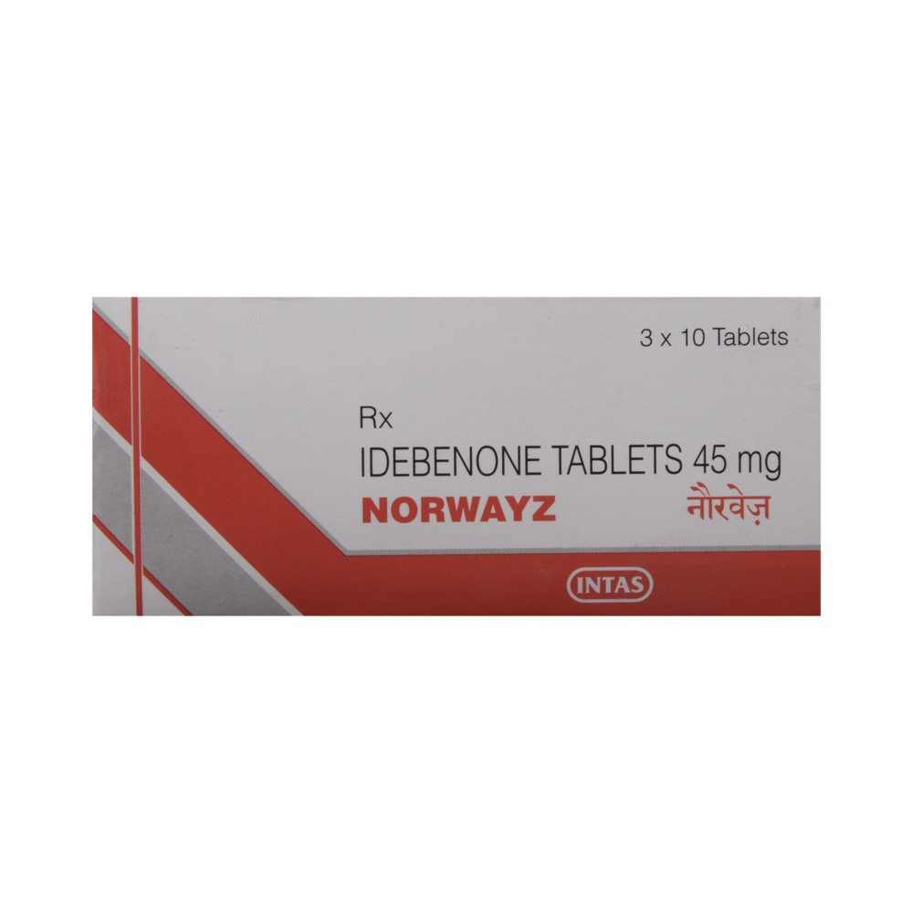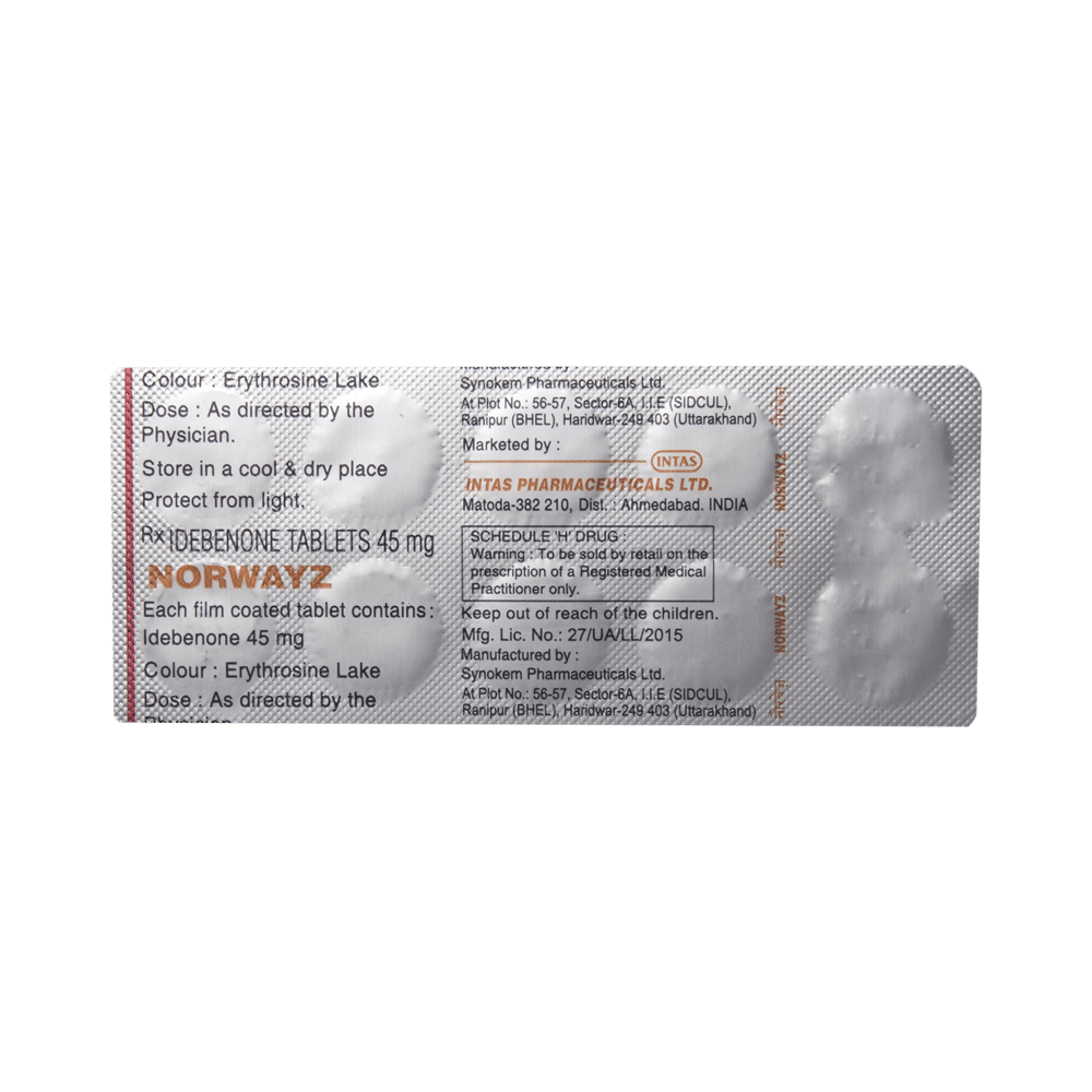 Norwayz Tablet is a prescription medicine used to treat Friedreich's ataxia and vision impairment in patients with Leber’s hereditary optic neuropathy, an eye disorder that can lead to loss of eyesight. This way it helps in improving the lost eyesight. Norwayz Tablet is taken with food, preferably at the same time each day. Take this medicine as advised by your doctor and if you have missed a dose, take it as soon as you remember. Do not skip any doses and finish the full course of treatment. It is important that this medication is not stopped suddenly without talking to your doctor.Some common side effects of using this medication are inflammation of the throat and nasal passages, cough, and back pain. This medicine may cause diarrhea, so drink plenty of fluids to keep yourself hydrated while taking this medicine. It may make your urine reddish-brown in color but it is harmless.Before taking this medicine, please inform your doctor if you have a history of liver or kidney diseases. Moreover, your doctor may regularly monitor your eyesight, blood counts, and liver function while you are on treatment with this medicine.